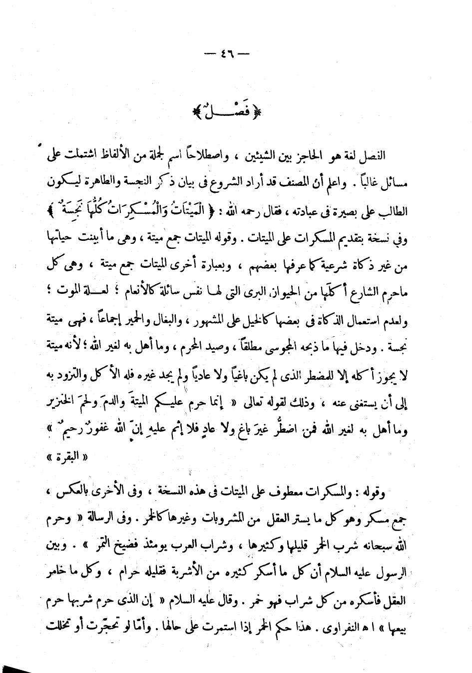 الفصل لغة هو الحاجز بين الشيئين، واصطلاحا اسم لجملة من الألفاظ اشتملت على مسائل غالبا. واعلم أن المصنف قد أراد الشروع في بيان ذكر النجسة والطاهرة ليكون الطالب على بصيرة في عبادته، فقال رحمه الله: " الميتات والمسكرات كلها نجسة " وفي نسخة بتقديم المسكرات على الميتات. وقوله الميتات جمع ميتة، وهي أبينت حياتها من غير ذكاة شرعية كما عرفها بعضهم، وبعبارة أخرى الميتات جمع ميتة، وهي كل ما حرم الشارع أكلها من الحيوان البري التي لها نفس سائلة كالأنعام؛ لعله الموت؛ ولعدم استعمال الذكاة في بعضها كالخيل على المشهور، والبغال والحمير إجماعا، فهي ميتة نجسة. ودخل فيها ما ذبحه المجوسي مطلقا وصيد المحرم، وما أهل به لغير الله؛ لأنه لا يجوز أكله إلا للمضطر الذي لم يكن باغيا ولا عاديا ولم يجد غيره فله الأكل والتزود به على أن