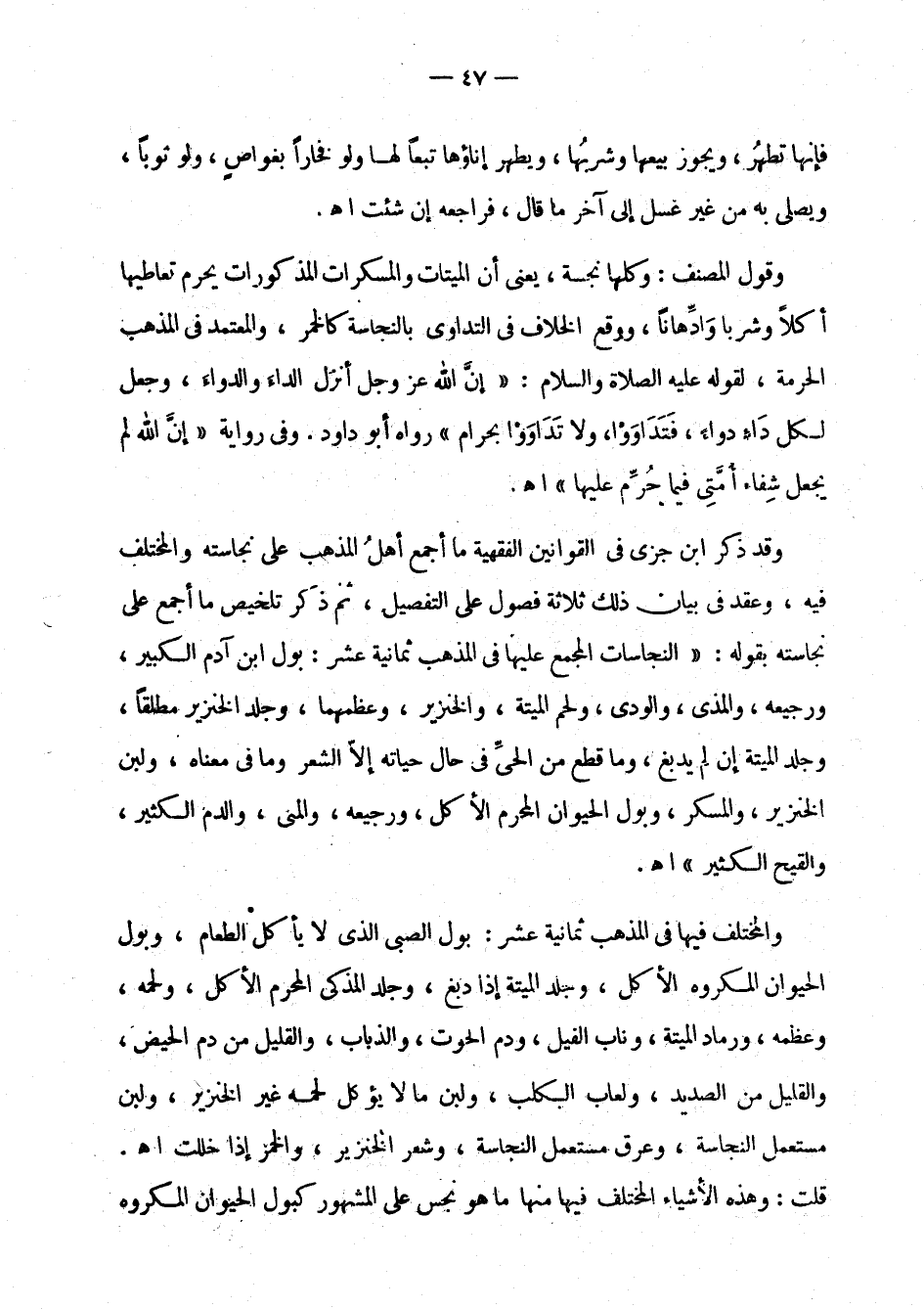 والمختلف فيها في المذهب ثمانية عشر: بول الصبي الذي لا يأكل الطعام، وبول الحيوان المكروه الأكل، وجلد الميتة إذا دبغ، وجلد المذكى المحرم الأكل، ولحمه، وعظمه، ورماد الميتة، وناب الفيل، ودم الحوت، والذباب، والقليل من دم الحيض، والقليل من الصديد، ولعاب الكلب، ولبن ما لا يؤكل لحمه غير الخنزير، ولبن مستعمل النجاسة، وعرق مستعمل النجاسة، وشعر الخنزير، والخمر إذا خللت اهـ. قلت: وهذه الأشياء المختلف فيها منها ما هو نجس على المشهور كبول الحيوان المكروه