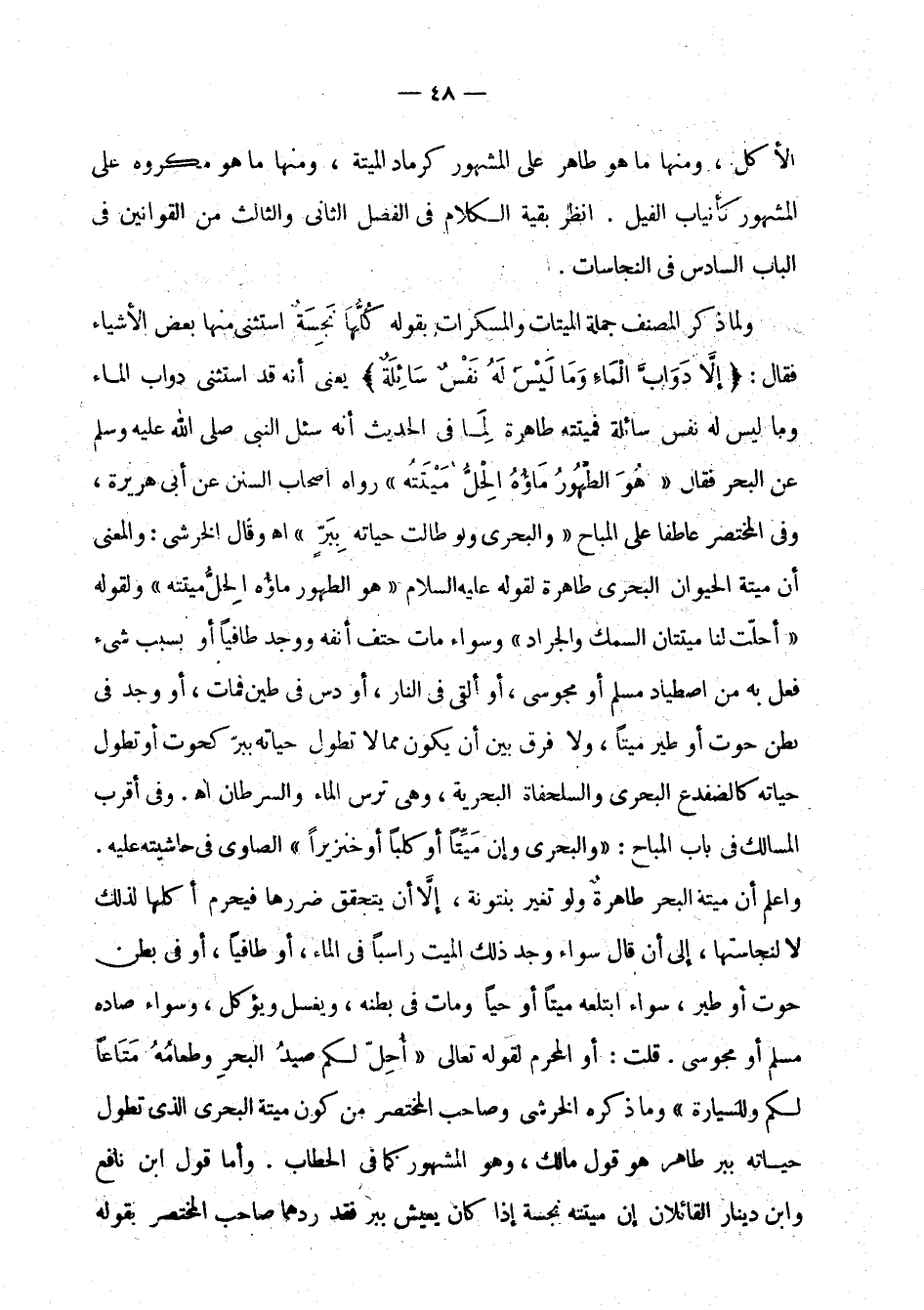 ولما ذكر المصنف جملة الميتات والمسكرات بقوله كلها نجسة استثنى منها بعض الأشياء فقال: " إلا دواب الماء وما ليس له نفس سائلة " يعني أنه قد استثنى دواب الماء وما ليس له نفس سائلة فميتته طاهرة لما في الحديث أنه سئل النبي صلى الله عليه وسلم عن البحر فقال: " هو الطهور ماؤه الحل منيته " رواه أصحاب السنن عن أبي هريرة، وفي المختصر عاطفا على المباح " والبحري ولو طالت حياته ببر " اهـ، وقال الخرشي: والمعنى أن ميتة الحيوان البحري طاهرة لقوله عليه السلام: " هو الطهور ماؤه الحل ميتته " ولقوله: " أحلت لنا ميتتان السمك والجراد " وسواء مات حتف أنفه ووجد طافيا أو بسبب شيء فعل به من اصطياد مسلم أو مجوسي، أو ألقي في النار، أو دس في طين فمات، أو وجد في بطن حوت أو طير ميتا، ولا فرق بين أن يكون مما لا تطول حياته ببر كحوت أو تطول حياته كالضفدع البحري والسلحفاة البحرية، وهي ترس الماء والسرطان اهـ. وفي اقرب المسالك في باب المباح: " والبحري وإن ميتا أو كلبا أة خنزيرا " الصاوي في حاشيته عليه. واعلم أم ميتة البحر طاهرة ولو تغير بنتونة، إلا أن يتحقق ضررها فيحرم أكلها لذلك لا لنجاستها، إلى أن قال سواء وجد ذلك الميت راسبا في الماء، أو طافيا، أو في بطن حوت أو طير، سواء ابيلعه ميتا أو حيا ومات في بطنه، ويغسل ويؤكل، وسواء صاده مسلم أو مجوسي. قلت: أو المحرم لقوله تعالى: {أُحِلَّ لَكُمْ صَيْدُ الْبَحْرِ وَطَعَامُهُ مَتَاعًا لَّكُمْ وَلِلسَّيَّارَةِ} [المائدة: 96] وما ذكره الخرشي وصاحب المختصر من كون ميتة البحري الذي تطول حياته ببر طاهر هو قول مالك، وهو المشهور كما في الحطاب. وأما قول ابن نافع وابن دينار القائلان إن ميتته نجسة إذا كان يعيش ببر فقد ردهما صاحب المختصر بقوله
