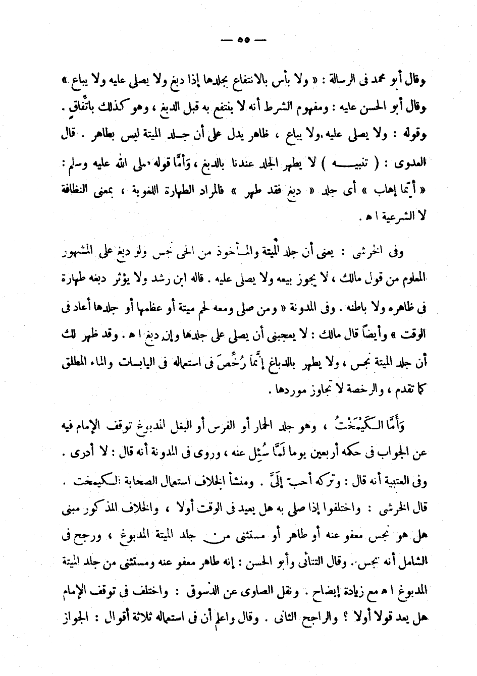 وقال أبو محمد في الرسالة: " ولا بأس بالانتفاع بجلدها إذا دبغ ولا يصلي عليه ولا يباع " وقال أبو الحسن عليه: ومفهوم الشرط أنه لا ينتفع به قبل الدبغ،