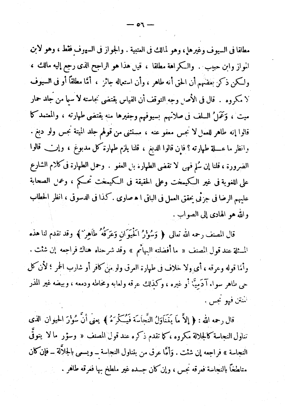 قال رحمه الله: " إلا يتناول النجاسة فيكره " يعني أن سؤر الحيوان الذي تناول النجاسة كالجلالة مكروه، كما تقدم ذكره عند ول المصنف: " وسؤر ما لا يتوقى النجاسة " فراجعه إن شئت. وأما عرق من يتناول النجاسة - ويسمى بالجلالة - فإن كان متلطخا فعرقه نجس، وإن جسده غير ملطخ بها فعرقه طاهر.