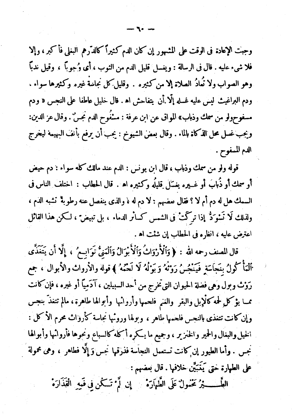 قال خليل عاطفا على النجس: " ودم مسفوح ولو من سمك وذباب " المواق عن ابن عرفة: مسفوح الدم نجس. وقال عز الدين: ويجب غسل محل الذكاة بالماء. وقال بعض الشيوخ: يجب أن يرفع بأنف البهيمة ليخرج الدم المسفوح.