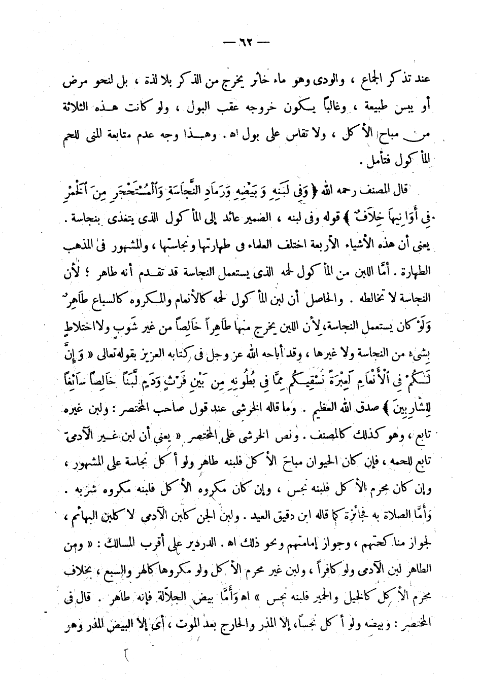 قال المصنف رحمه الله: " وفي لبنه وبيضه ورماد النجاسة والمستحجر من الخمر في أوانيها خلاف " قوله وفي لبنه، الضمير عائد إلى المأكول الذي يتغذى بنجاسة. يعني أن هذه الأشياء الأربعة اختلف العلماء في طهارتها ونجاستها والمشهور في المذهب الطهارة. أما اللبن من المأكول لحمه الذي يستعمل النجاسة قد تقدم أنه طاهر؛ لأن النجاسة لا تخالطه. والحاصل أن لبن المأكول لحمه كالأنعام والمكروه كالسباع طاهر ولو كان يستعمل النجاسة، لأن اللبن يخرج منها طاهرا خالصا من غير شةب ولا اختلاط بشيء من النجاسة ولا غيرها، وقد أباحه الله عز وجل في كتابه العزيز بقوله تعالى: {وَإِنَّ لَكُمْ فِي الأَنْعَامِ لَعِبْرَةً نُّسْقِيكُم مِّمَّا فِي بُطُونِهِ مِن بَيْنِ فَرْثٍ وَدَمٍ لَّبَنًا خَالِصًا سَآئِغًا لِلشَّارِبِينَ} [النحل: 66] صدق الله العظيم. وما قاله الخرشي عند قول صاحب المختصر: ولبن غيره تابع، وهو كذلك كالمصنف. ونص الخرشي على المختصر " يعني أن لبن غير الآدمي تابع للحمه، فإن كان محرم الأكل فلبنه نجس، وإن كان مكروه الأكل فلبنه مكروه شربه. وأما الصلاة به فجائزة كما قاله ابن دقيق العيد. ولبن الجن كلبن الآدمي لا كلبن البهائم، لجواز مناكحتهم، وجواز إمامتهم ونحو ذلك اهـ. الدردير على أقرب المسالك: " ومن الطاهر لبن الآدمي ولو كافرا، ولبن غير محرم الأكل ولو كان مكروها كالهر والسبع، بخلاف محرم الأكل كالخيل والحمير فلبنه نجس " اهـ. وأما بيض الجلالة فإنه طاهر. قال في المختصر: وبيضه ولو أكل نجسا إلا المذر والخارج بعد الموت، أي إلا بيض المذر وهو