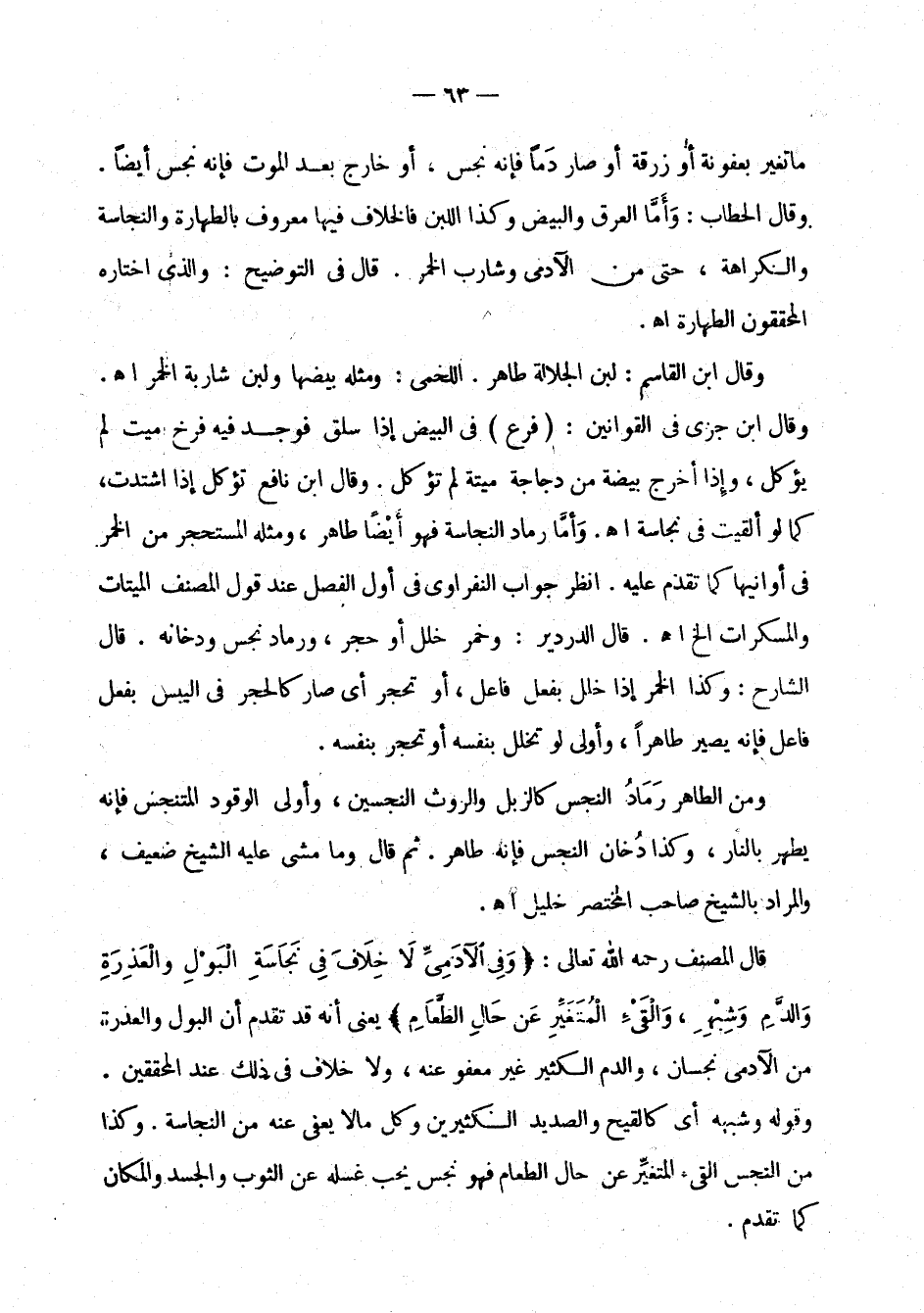 ومن الطاهر رماد النجس كالزبل والروث النجسين، وأولى الوقود المتنجس فإنه يطهر بالنار، وكذا دخان النجس فإنه طاهر. ثم قال وما مشى عليه الشيخ ضعيف، والمراد بالشيخ صاحب المختصر خليل اهـ.