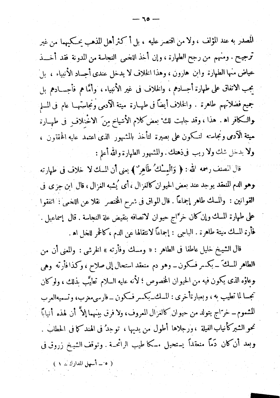 ومنهم من رجح الطهارة، وإن أخذ اللخمي النجاسة من المدونة فقد أخذ عياض منها الطهارة وابن هارون، وهذا الخلاف لا يدخل عندي أجساد الأنبياء، بل يجب الاتفاق على طهارة أجسادهم، والخلاف في غير الأنبياء، وأما هم فأجسادهم بل جميع فضلاتهم طاهرة. والخلاف أيضا في طهارة ميتة الآدمي ونجاستها عام في المسلم والكافر اهـ. هذا، وقد جلبت لك بعض كلام الأشياخ من الاختلاف في طهارة ميتة الآدمي ونجاسته لتكون على بصيرة لتأخذ بالمشهور الذي اعتمد عليه المحققون، ولا يدخل شك ولا ريب في ذهنك. والمشهور الطهارة والله أعلم.