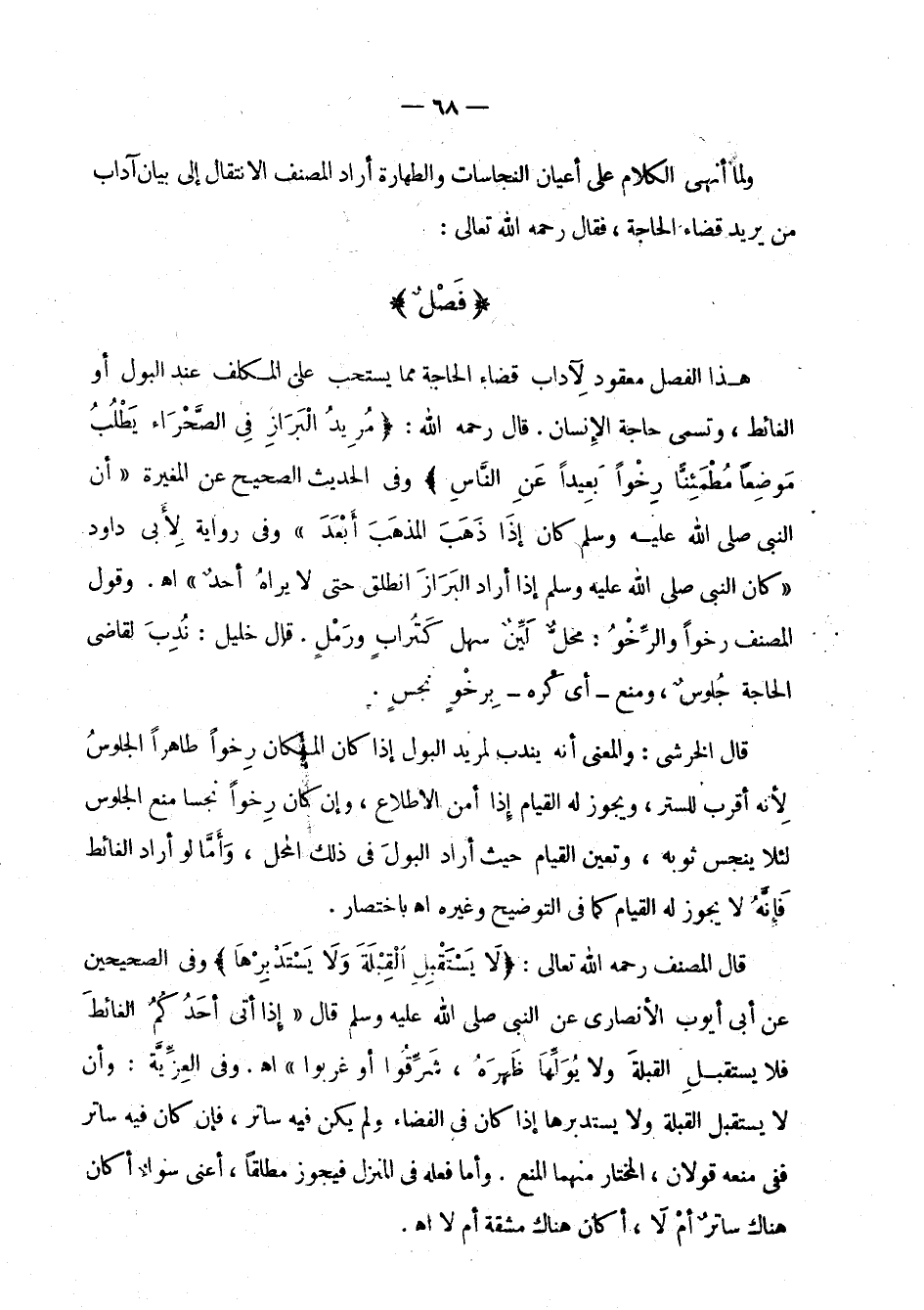 هذا الفصل معقود لآداب قضاء الحاجة مما يستحب على المكلف عند البول أو الغائط، وتسمى حاجة الإنسان. قال رحمه الله: " مريد البراز في الصحراء يطلب موضعا مطمئنا رخوا بعيدا عن الناس " وفي الحديث الصحيح عن المغيرة: " أن النبي صلى الله عليه وسلم كان إذا ذهب المذهب أبعد " وفي رواية لأبي داود: " كان النبي صلى الله عليه وسلم إذا أراد البراز انطلق حتى لا يراه أحد " اهـ. وقول المصنف رخوا والرخو: محل لين سهل كتراب ورمل. قال خليل: ندب لقاضي الحاجة جلوس، ومنع - أي كره - برخو نجس.