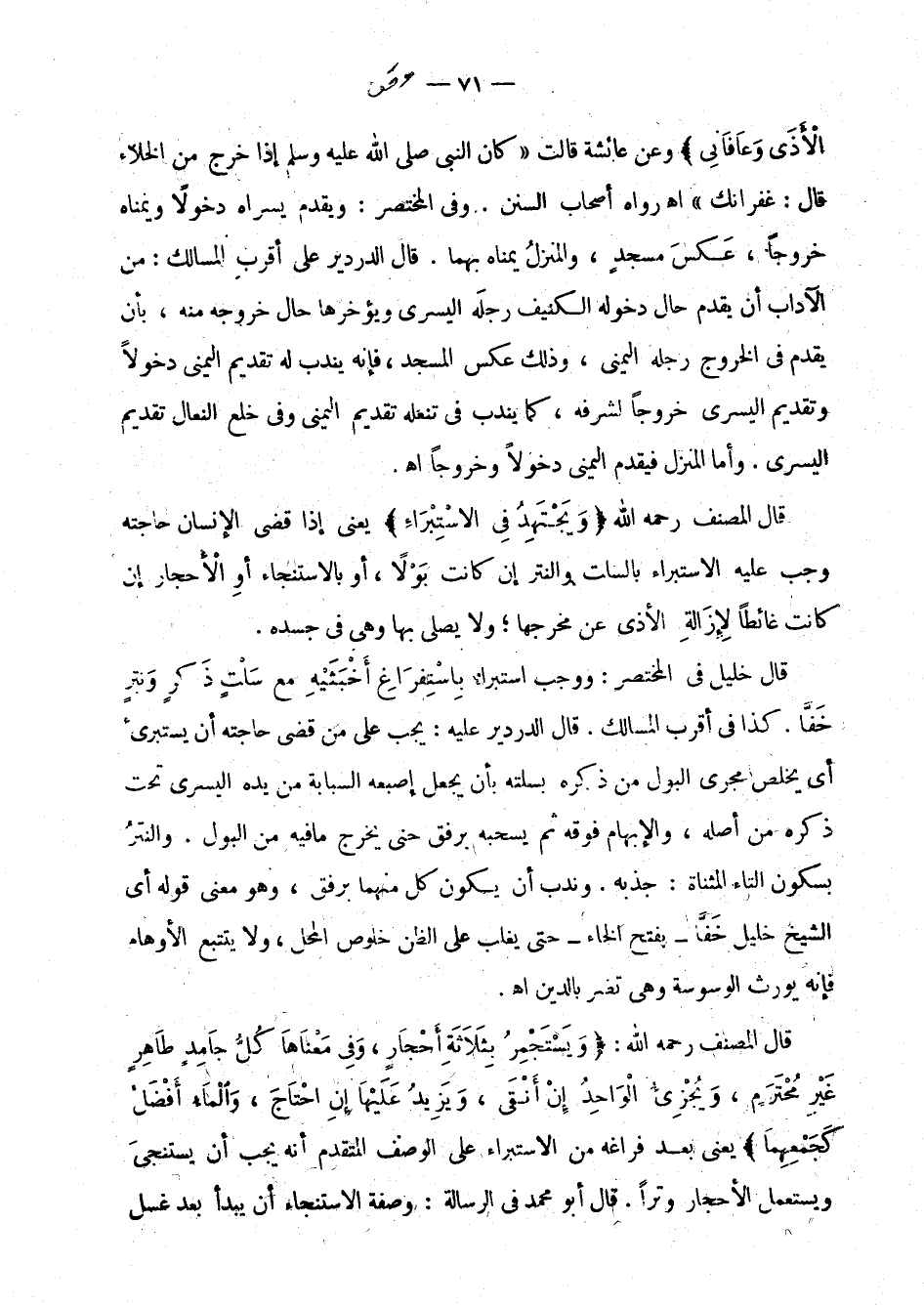 الأذى وعافاني " وعن عائشة قالت: " كان النبي صلى الله عليه وسلم إذا خرج من الخلاء قال: " غفرانك " اهـ، رواه أصحاب السنن. وفي المختصر: قال الدردير على أقرب المسالك: من الآداب أن يقدم حال دخوله الكنيف رجله اليسرى ويؤخرها حال خروجه منه، بأن يقدم في الخروج رجله اليمنى، ذلك عكس المسجد، فإنه يندب له تقديم اليمنى دخولا وتقديم اليسرى خروجا لشرفه، كما يندب في تنعله تقديم اليمنى وفي خلع النعال تقديم اليسرى. وأما المنزل فيقدم اليمنى دخولا وخروجا اهـ.