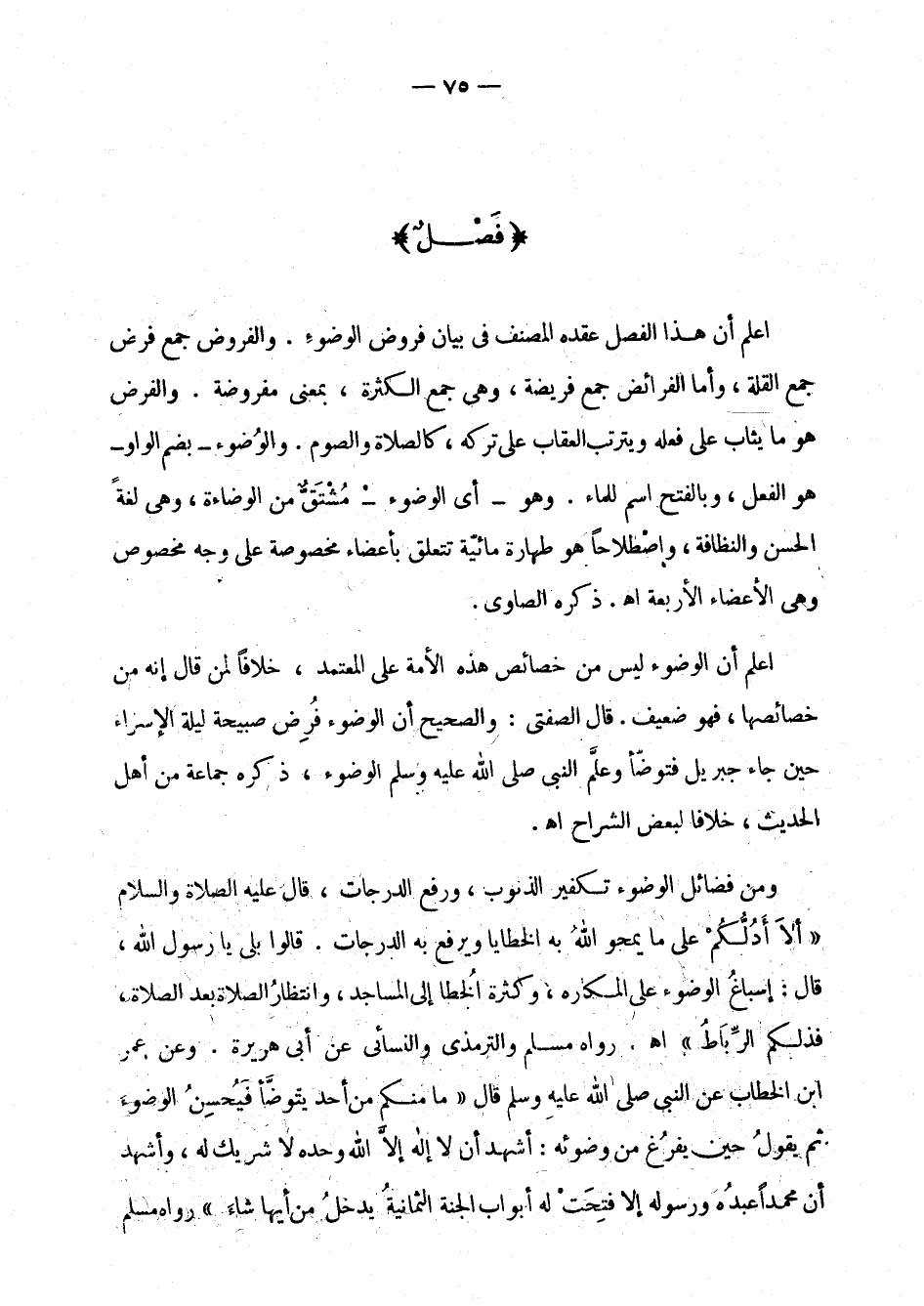 ومن فضائل الوضوء تكفير الذنوب، ورفع الدرجات، قال عليه الصلاة والسلام: " ألا أدلكم على ما يمحو الله به الخطايا ويرفع به الدرجات. قالوا بلى يا رسول الله، قال: إسباغ الوضوء على المكاره، وكثرة الخطا إلى المساجد، وانتظار الصلاة بعد الصلاة، فذلكم الرباط " اهـ. رواه مسلم والترمذي والنسائي عن أبي هريرة. وعن عمر بن الخطاب عن النبي صلى الله عليه وسلم قال: " ما منكم من أحد يتوضأ فيحسن الوضوء ثم يقول حين يفرغ من وضوئه: أشهد أن لا إله إلا الله وحده لا شريك له، وأشهد أن محمدا عبده ورسوله إلا فتحت له أبواب الجنة الثمانية يدخل من أيها شاء " رواه مسلم