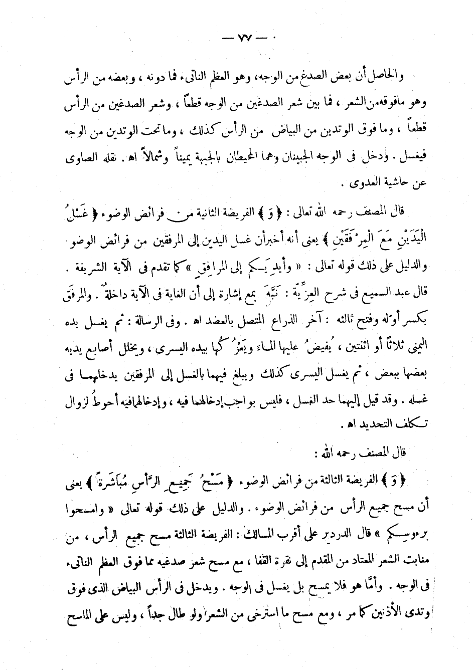 الرأس مباشرة " يعني أن مسح جميع الرأس من فرائض الوضوء. والدليل على ذلك قوله تعالى {وَامْسَحُواْ بِرُؤُوسِكُمْ} قال الدردير على أقرب المسالك: الفريضة الثالثة مسح جميع الرأس، من منابت الشعر المعتاد من المقدم إلى نقرة القفا، مع مسح شعر صدغيه مما فوق العظم الناتئ في الوجه. وأما هو فلا يمسح بل يغسل في الوجه.