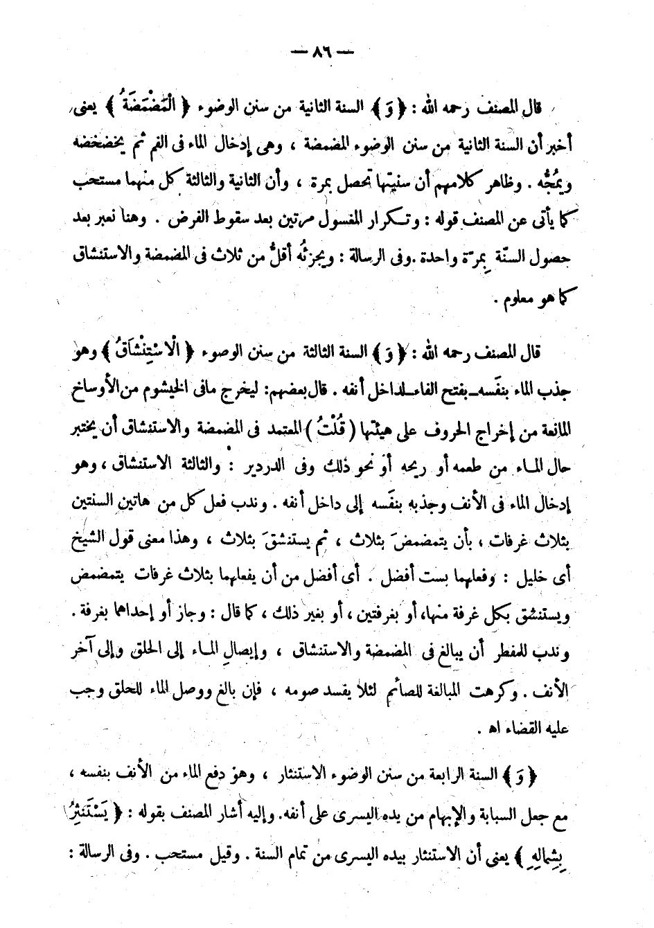 قال المصنف رحمه الله: " و " السنة الثالثة من سنن الوضوء: " الاستنشاق " وهو جذب الماء بنفسه - بفتح الفاء - لداخل أنفه. قال بعضهم: ليخرج ما في الخيشوم من الأوساخ المانعة من إخراج الحروف على هيئتها قلت: المعتمد في المضمضة والاستنشاق أن يختبر حال الماء من طعمه أو ريحه أو نحو ذلك وفي الدردير: والثالثة: الاستنشاق، وهو إدخال الماء في الأنف وجذبه بنفسه إلى داخل أنفه. وندب فعل كل من هاتين السنتين بثلاث غرفات، بأن يتمضمض بثلاث، ثم يستنشق بثلاث، وهذا معنى قول الشيخ أي خليل: وفعلهما بست أفضل. أي أفضل من أن يفعلهما بثلاث غرفات يتمضمض ويستنشق بكل غرفة منها، أو بغرفتين، أو بغير ذلك، كما قال: وجاز أن إحداهما بغرفة. وندب للمفطر أن يبالغ في المضمضة والاستنشاق، وإيصال الماء إلى الحلق وإلى آخر الأنف. وكرهت المبالغة للصائم لئلا يفسد صومه، فإن بالغ ووصل الماء للحلق وجب عليه القضاء اهـ.