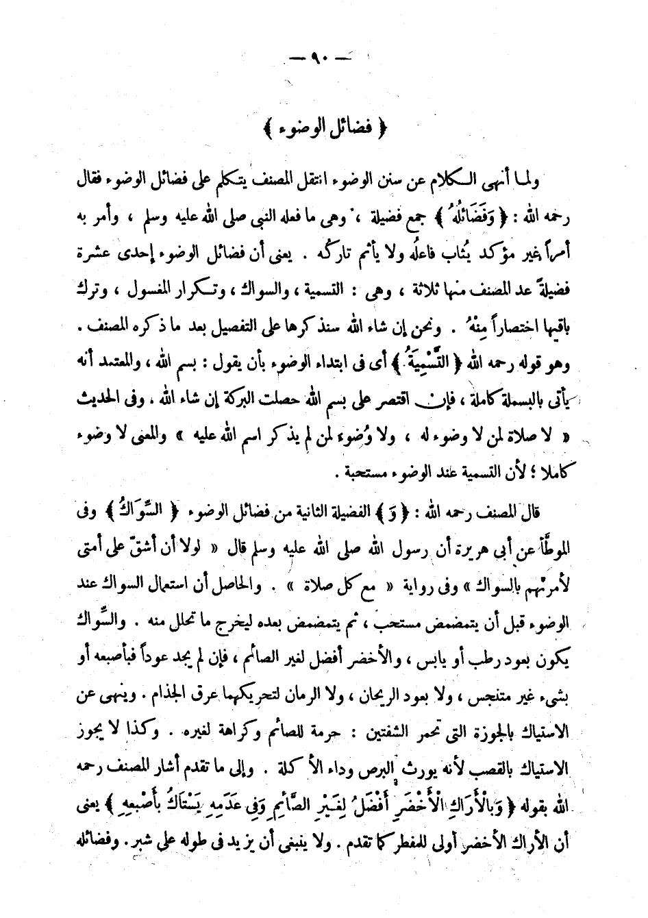 قال المصنف رحمه الله: " و " الفضيلة الثانية من فضائل الوضوء: " السواك " وفي الموطأ عن أبي هريرة أن رسول الله صلى الله عليه وسلم قال: " لولا أن أشق على أمتي لأمرتهم بالسواك " وفي رواية: " مع كل صلاة ". والحاصل أن استعمال السواك عند الوضوء قبل أن يتمضمض مستحب، ثم يتمضمض بعده ليخرج ما تحلل منه. والسواك يكون بعود رطب أو يابس، والأخضر أفضل لغير الصائم، فإن لم يجد عودا فبإصبعه أو بشيء غير متنجس، ولا بعود الريحان، ولا الرمان لتحريكهما عرق الجذام. وينهى عن الاستياك بالجوزة التي تحمر الشفتين: حرمة للصائم وكراهة لغيره، وكذا لا يجوز الاستياك بالقصب لأنه يورث البرص وداء الأكلة. وإلى ما تقدم أشار المصنف رحمه الله بقوله: " وبالأراك الأخضر أفضل لغير الصائم وفي عدمه يستاك بأصبعه " يعني أن الأراك الأخضر أولى للمفطر كما تقدم. ولا ينبغي أن يزيد في طوله على شبر. وفضائله