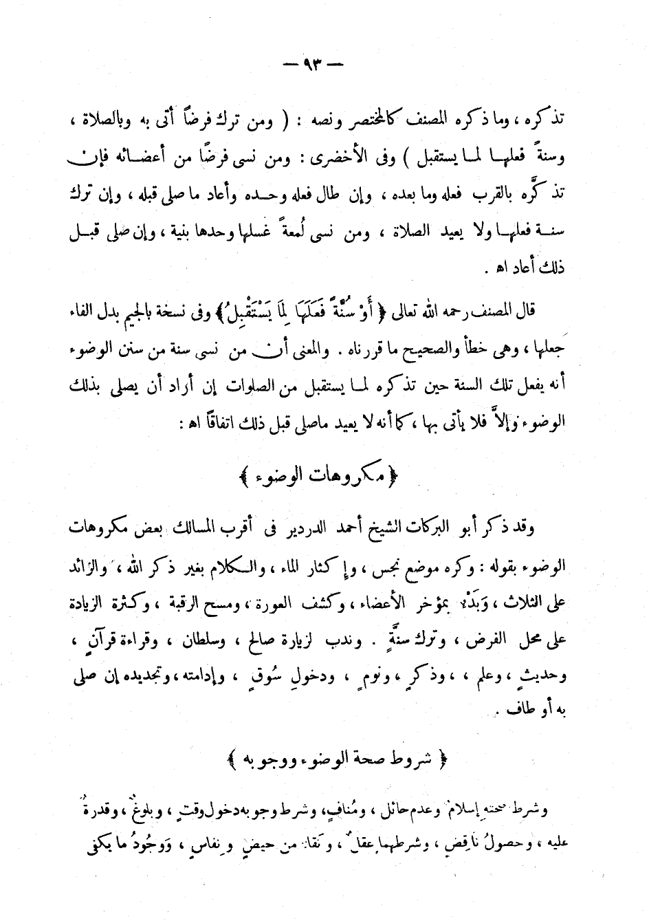 وقد ذكر أبو البركات الشيخ أحمد الدردير في أقرب المسالك بعض مكروهات الوضوء بقوله: وكره موضع نجس، وإكثار الماء، والكلام بغير ذكر الله، والزائد على الثلاث، وبدء بمؤخر الأعضاء، وكشف العورة، ومسح الرقبة، وكثرة الزيادة على محل الفرض، وترك سنة، وندب لزيارة صالح، وسلطان، وقراءة قرآن، وحديث، وعلم، وذكر، ونوم، ودخول سوق، وإدامته، وتجديده إن صلى به أو طاف.