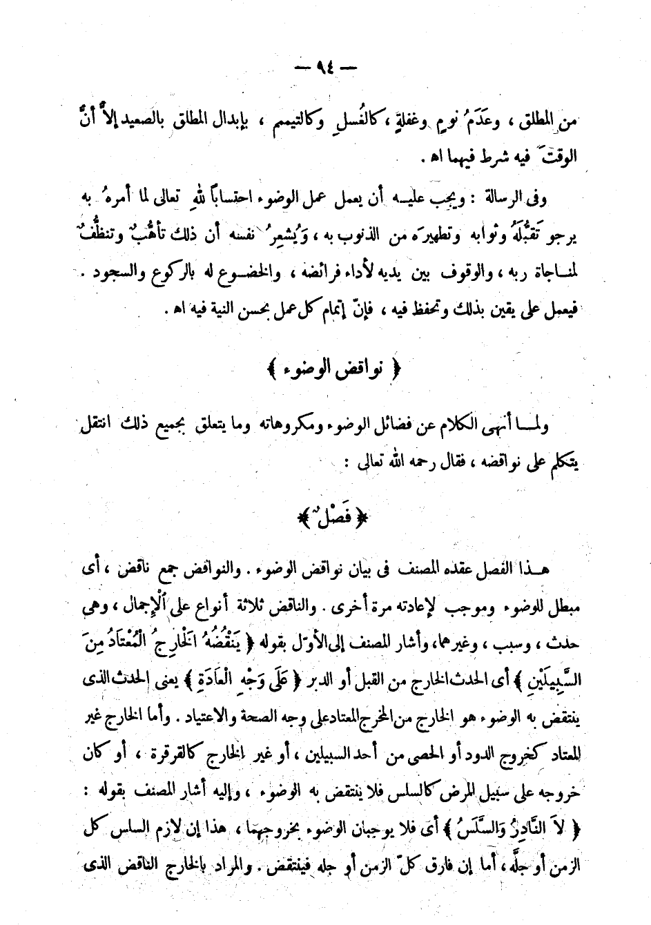 ولما أنهى الكلام على فضائل الوضوء ومكروهاته وما يتعلق بجميع ذلك انتقل يتكلم على نواقضه، فقال رحمه الله تعالى: