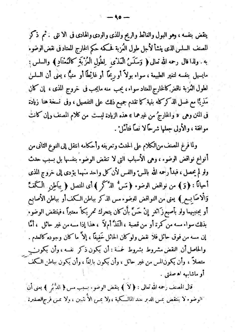 ولما فرغ المصنف من الكلام على الحدث وتعريفه وأحكامه انتقل إلى النوع الثاني من أنواع الوضوء، وهي الأسباب التي لا تنقض الوضوء بنفسها بل بسبب حدث ولو لم يحصل، فبدأ رحمه الله بالمس واللمس لأن كل واحد منهما يؤدي إلى خروج المذي أحيانا: " و " من نواقض الوضوء " مس الذكر " أي المتصل " بباطن الكف والأصابع " يعني من النواقض للوضوء مس الذكر بباطن الكف أو بباطن الأصابع أو بجنبيهما ولو بأصبع زائد إن حس بأن كان يتحرك تحريكا معتبرا، فينتقض الوضوء بذلك سواء مسه من كمرة أو من قصبة، التذ أم لا، هذا إذا مسه من غير حائل، أما إن مسه من فوق حائل فلا نقض ولو كان الحائل خفيفا، إلا ما كان وجوده كالعدم. والحاصل أن النقض مشروط بشروط خمسة: أن يكون ذكر نفسه، وأن يكون متصلا، وأن يكون المس من غير حائل، وأن يكون بالغا، وأن يكون بباطن الكف أو ما شابهه اهـ الصفتي.