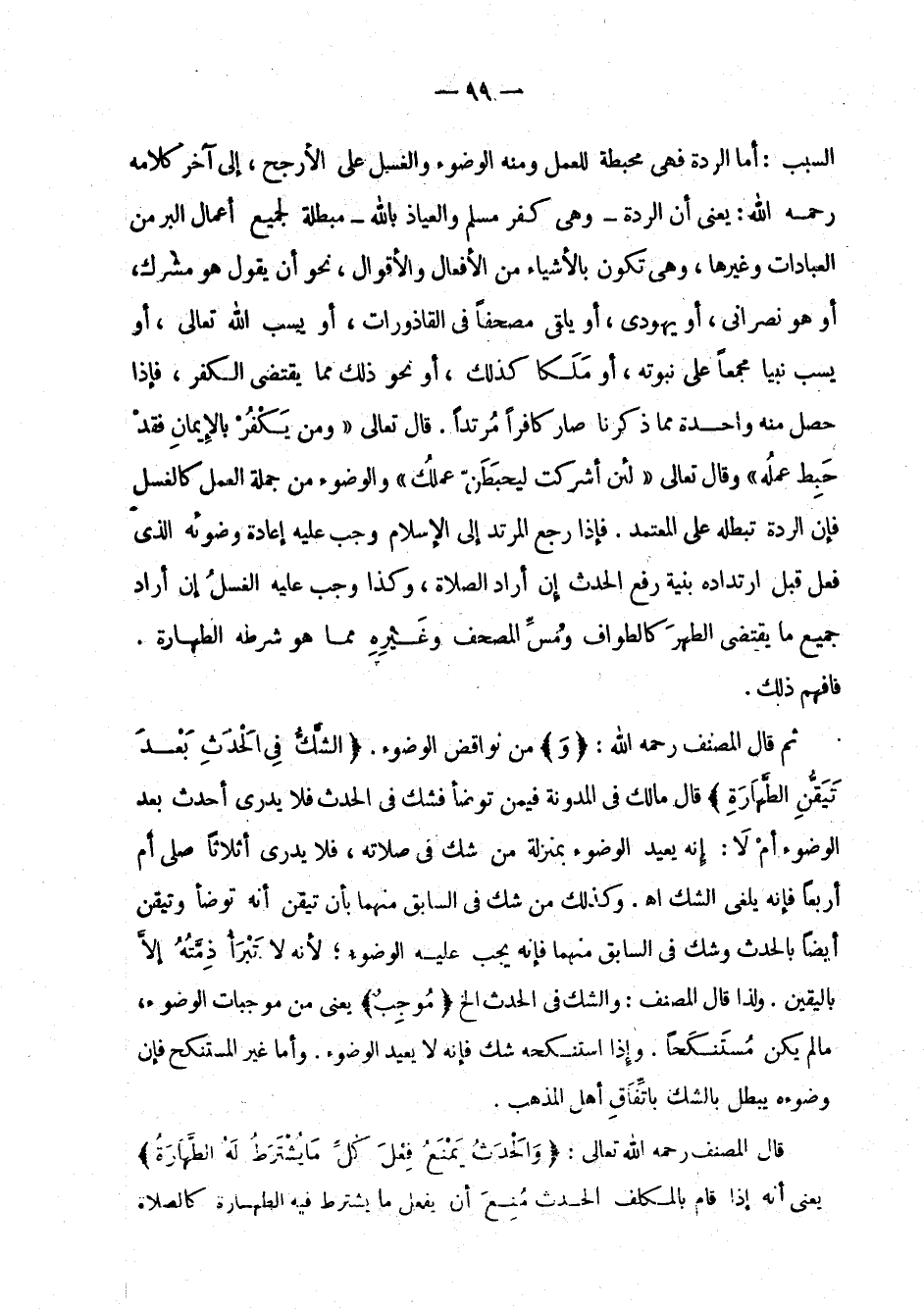 السبب: أما الردة فهي محبطة للعمل ومنه الوضوء والغسل على الأرجح، إلى آخر كلامه رحمه الله: يعني أن الردة - وهي كفر مسلم والعياذ بالله - مبطلة لجميع أعمال البر من العبادات وغيرها، وهي تكون بالأشياء من الأفعال والأقوال، نحو أن يقول هو مشرك، أو هو نصراني، أو يهودي، أو يلقي مصحفا في القاذورات، أو يسب الله تعالى، أو يسب نبيا مجمعا على نبوته، أو ملكا كذلك، أو نحو ذلك مما يقتضي الكفر، فإذا حصل منه واحدة مما ذكرنا صار كافرا مرتدا. قال تعالى: {وَمَن يَكْفُرْ بِالإِيمَانِ فَقَدْ حَبِطَ} [المائدة: 5] وقال تعالى: {لَئِنْ أَشْرَكْتَ لَيَحْبَطَنَّ عَمَلُكَ} [الزمر: 65] والوضوء من جملة العمل كالغسل فإن الردة تبطله على المعتمد. فإذا رجع المرتد إلى الإسلام وجب عليه إعادة وضوئه الذي فعل قبل ارتداده بنية رفع الحدث إن أراد الصلاة، وكذا وجب عليه الغسل إن أراد جميع ما يقتضي الطهر كالطواف ومس المصحف وغيرع مما هو شرطه الطهارة. فافهم ذلك.