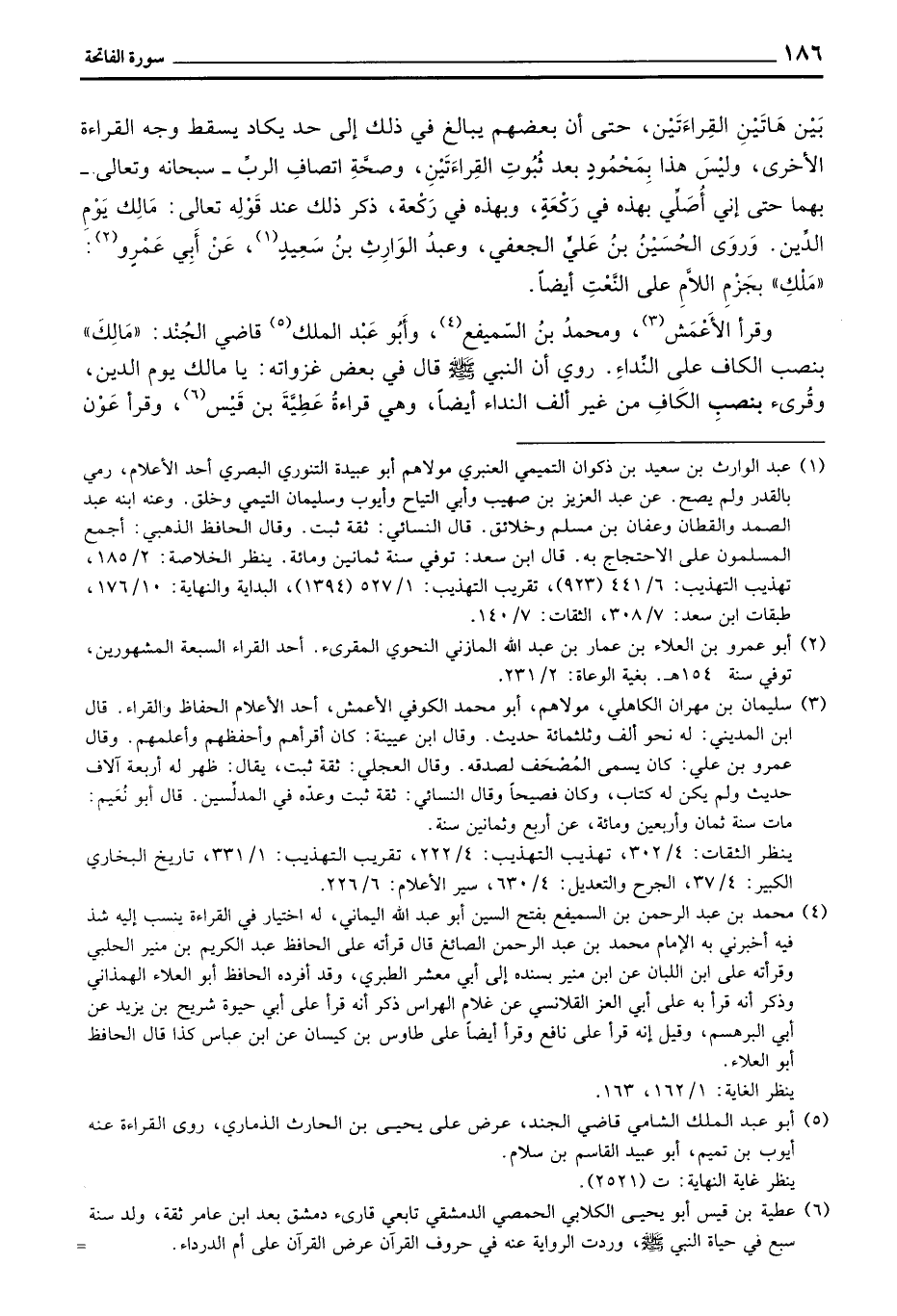 بَيْنَ هَاتَيْنِ القِرَاءَتَيْنِ، حتى أن بعضهم يبالغ في ذلك إلى حد يكاد يسقط وجه القراءة الأخرى، ولَيْسَ هذا بِمَحْمُودٍ بعد ثُبُوتِ القِرَاءَتَيْنِ، وصحَّةِ اتصافِ الربِّ - سبحانه وتعالى - بهما حتى إني أُصَلِّي بهذه في رَكْعَةٍ، وبهذه في رَكْعةٍ، ذكر ذلك عند قَوْلِهِ تعالى: مَالِك يَوْمِ الدِّين. وَرَوى الحُسَيْنُ بنُ عَليٍّ الجعفي، وعبدُ الوَارِثِ بنُ سَعِيدٍ، عَنْ اَبِي عَمْروٍ: «مَلْكِ» بِجَزْمِ اللاَّمِ على النَّعْتِ أيضاً.