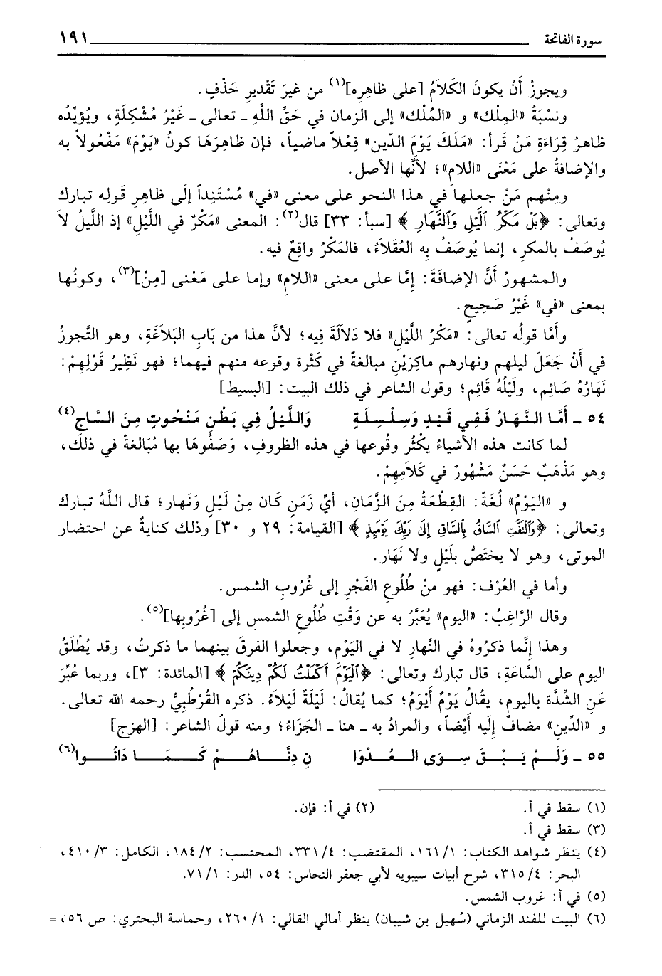 ونسْبَةُ «المِلك» والمُلْك «إلى الزمان في حَقِّ اللهِ - تعالى - غَيْرُ مُشْكِلِةٍ، ويُؤيِّدُه ظاهرُ قِرِاءَةِ مَنْ قَرأ:» مَلَكَ يَوْمَ الدّين «فِعْلاً ماضياً، فإن ظاهِرَهَا كونُ» يَوْمَ «مَفْعُولاً به والإضافةُ على مَعْنَى» اللامِ «، لأنَّها الأصل.