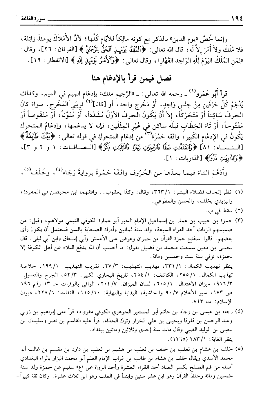 قرأ أَبُو عَمْرو - رَحِمَهُ اللهُ تعالى: - «الرَّحِيم ملك» بإدغام الميمِ في الميمِ، وكذلك يُدْغِمُ كُلُّ حَرْفَيْنِ مِنْ جِنْسٍ وَاحِدٍ، أَوْ مَخْرج واحد، أو [كانا] قرِيبَي المَخْرج، سواءٌ كانَ الحرفُ سَاكِناً أَوْ مُتَحَرِّكاً، إلاُّ أَنْ يَكُونَ الحرفُ الأوَّلُ مُشَدَّداً، أَوْ مُنَوَّناً، أَوْ مَنْقُوصاً أَوْ مَفْتُوحاً، أوْ تَاءَ الخِطَابِ قبلَه ساكِن في غَيْرِ المِثْلَين، فإنه لا يدغمها وإدغامُ المتحرك يَكُونُ في الإدغَامِ الكَبيرِ، وافَقه حَمْزَة من إدغام المتحركِ في قوله تعالى: {بَيَّتَ طَآئِفَةٌ} [النساء: 81] [الصافات: 1 و2 و3] ، {والذاريات ذَرْواً} [الذاريات: 1] .