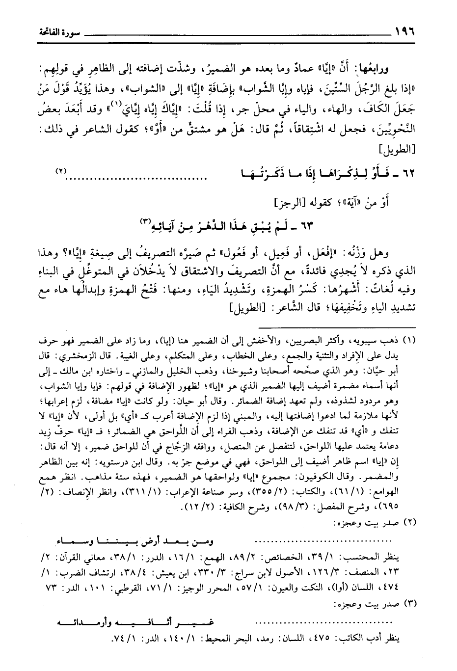 63 - لَمْ يُبْقِ هَذَا الدَّهْرُ مِنْ آيَائِهِ ... وهل وَزْنُه: «إفْعَل، أو فَعِيل، أو فَعُول» ثم صَيَّره التصريفُ إلى صِيغةِ «إيَّا؟ وهذا الذي ذكره لا يُجْدِي فائدةً، مع أنَّ التصريفَ والاشتقاق لاَ يَدْخُلان في المتوغِّل في البناءِ وفيه لُغاتٌ: أَشْهَرُها: كَسْرُ الهمزةِ، وتَشْدِيدُ اليَاءِ، ومنها، فَتْحُ الهمزةِ وإبدالها هاء مع تشديدِ الياءِ وتَخْفِيفها؛ قال الشَّاعر: [الطويل]