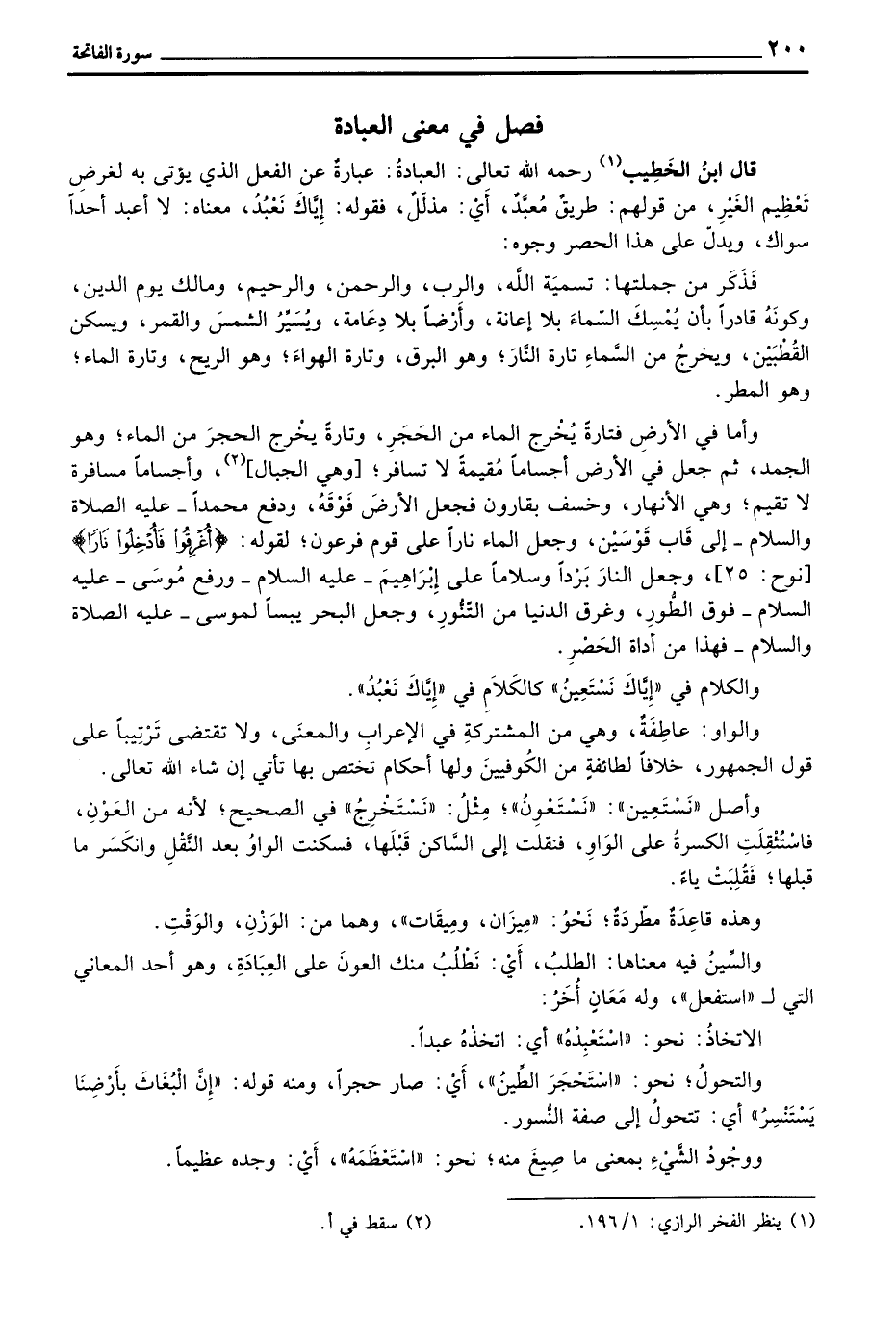 قال ابنُ الخَطيب رَحِمَهُ اللهُ تعالى: العبادةُ عبارةٌ عن الفعل الذي يؤتى به لغرض تَعْظِيم الغَيْرِ، من قولهم: طريقٌ مُعّبَّدٌ، أَيْ: مذلَّلٌ، فقوله: إيَّاكَ نَعْبُدُ، معناه: لا أعبد أحداً سواك، ويدلُّ على هذا الحصر وجوه: