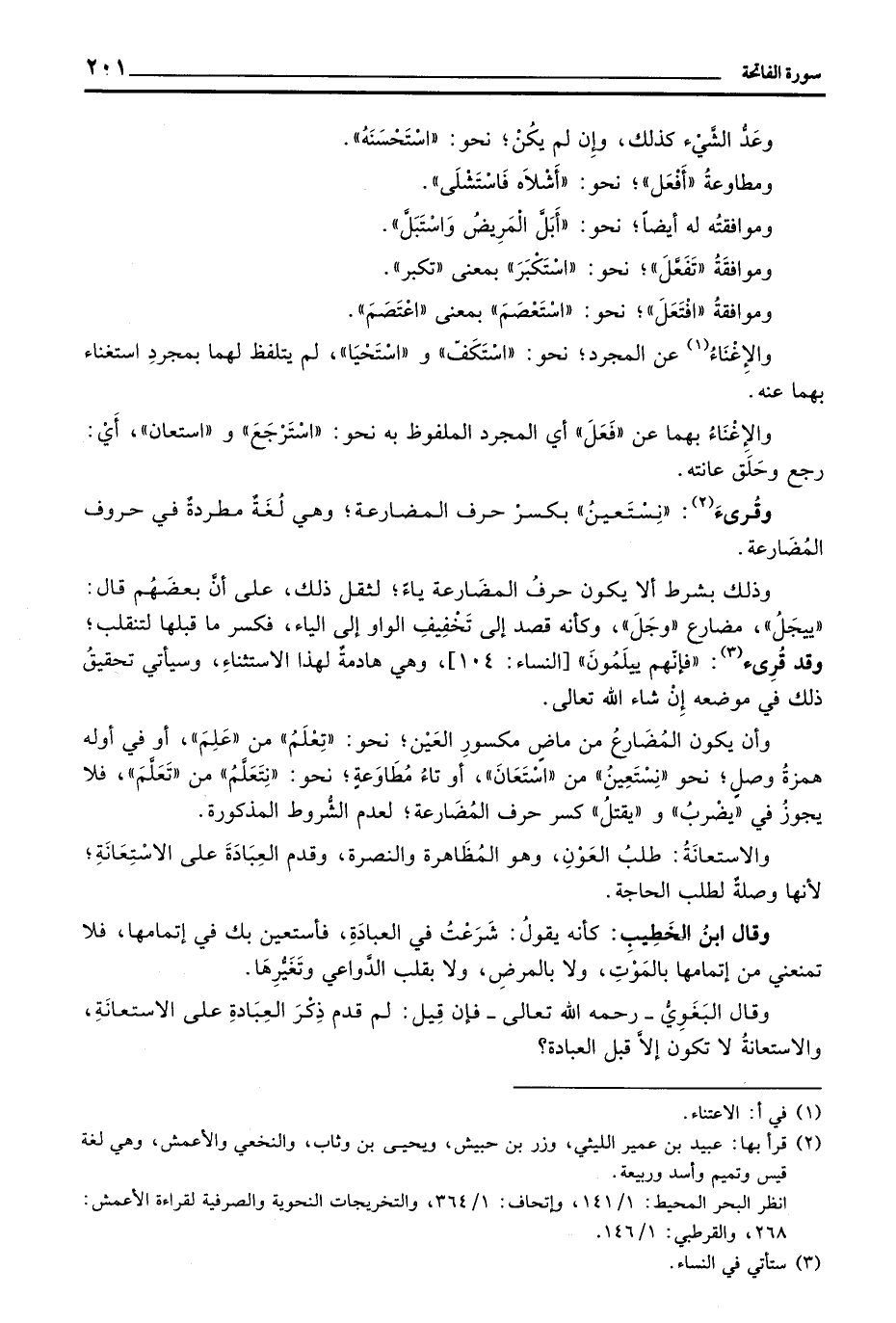 وقال ابنُ الخَطيبِ: كأنه يقولُ: شَرَعْتُ في العِبَادَةِ: فأستعين بك في إتمامها، فلا تمنعني من إتمامها بالمَْوتِ، ولا بالمرضِ، ولا بقلب الدَّواعي وتَغَيُّرِها.