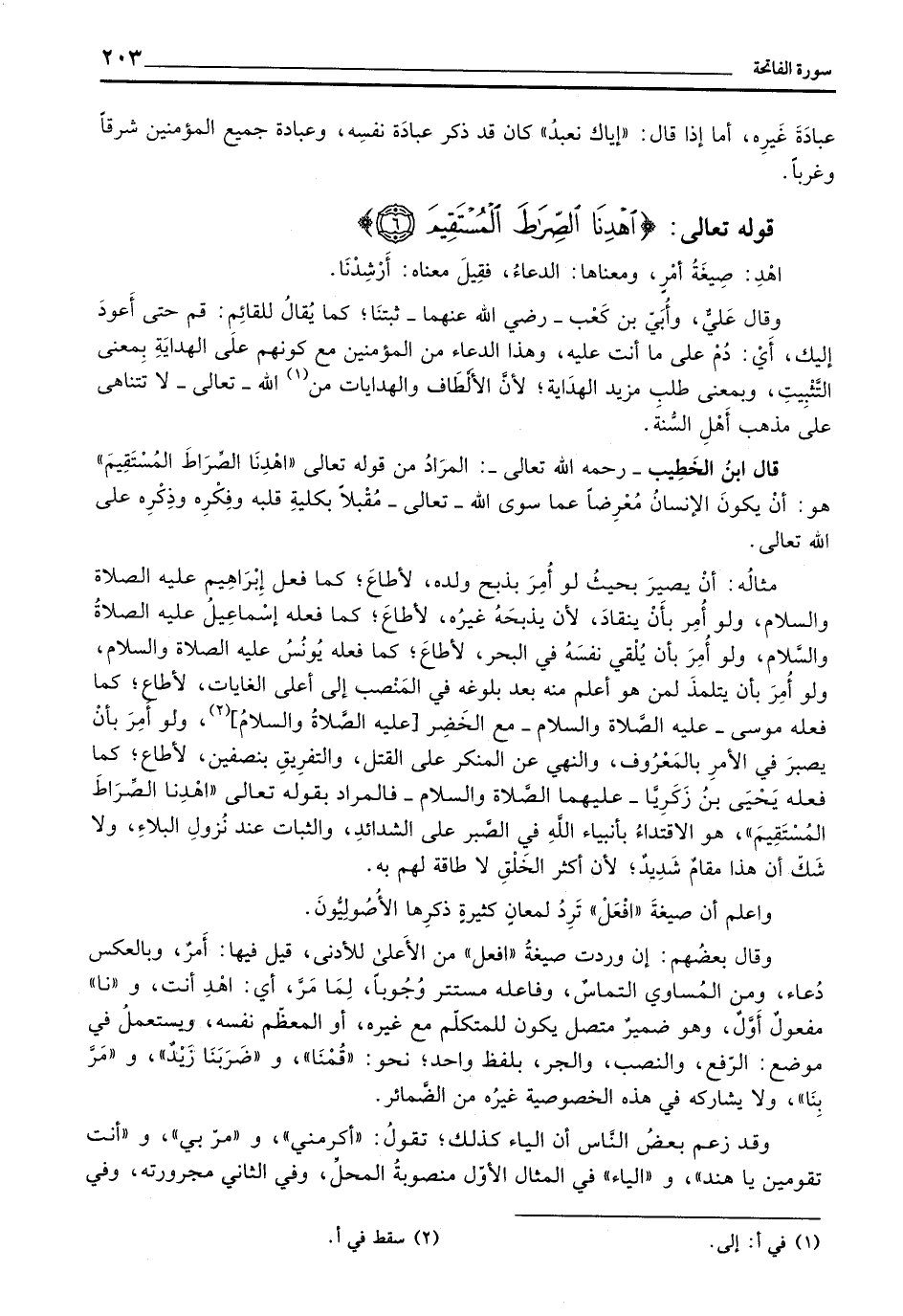 قال ابنُ الخَطِيب - رَحِمَهُ اللهُ تعالى -: المرَادُ من قوله تعالى: «اهِدِنَا الصِّرَاطَ المُسْتَقِيمَ» هو: أنْ يكونَ الإنسانُ مُعْرِضاً عما سوى الله - تعالى - مُقْبِلا بكليةِ قلبه وفِكْرِه وذِكْرِه على الله تعالى.