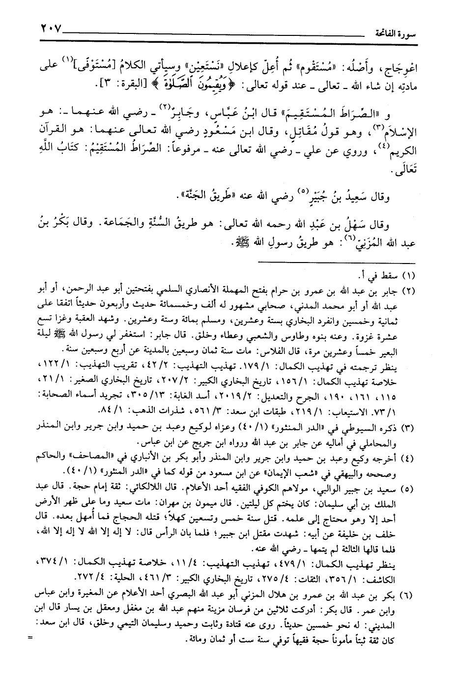 و «الصِّرَاطَ المُسْتَقِيمَ» قال ابنُ عَبَّاسٍ، وجَابِرٌ - رَضِيَ اللهُ عَنْهما -: هو الإسْلام، وهو قولُ مُقَاتِلٍ، وقال ابنُ مَسْعودٍ رضي الله تعالى عنهما: هو القرآن الكريم، وروي عن علي - رضي الله تعالى عنه - مرفوعاً: الصِّرَاطُ المُسْتَقِيمُ: كِتَابُ اللهِ تَعَالى.