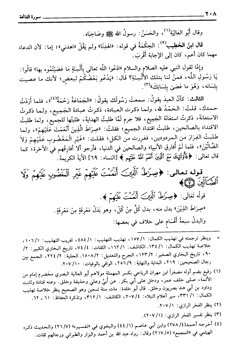 الثالث: كانّ العبدَ يقولُ: سمعتُ رَسُولَك يقولُ: «الجَمَاعَةُ رَحْمَةٌ» ، فلما أَرَدْتُ حمدك، قلتُ: الحَمْدُ لله، ولما ذكرت العبادة، ذكرُ عبادةَ الجَمِيع، ولما ذكرتُ الاستعانةَ، ذكرتُ استعَانَة الجَمِيع، فلا جرم لَمَّا طلبتُ الهدايةَ، طلبتُها للجميع، ولما طلبتُ الاقتداءَ بالصالحين، طلبتُ اقتداءَ الجميع؛ فقلتُ: «غَيْرَ الْمَغْضُوبِ عَلَيْهِمْ وَلاَ الضَّالِّيْنَ» ، فلما لَمْ أُفارِق النبياءَ والصالحين في الدنيا، فأرجو ألا أفارِقََهم في الآخرة؛ كما قال تعالى: {فأولئك مَعَ الذين أَنْعَمَ الله عَلَيْهِم} [النساء: 69] الآية الكريمةَ.