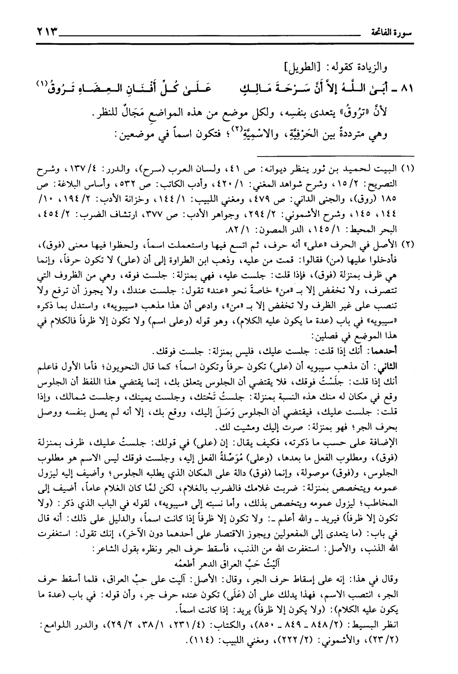 81 - أبَى اللهُ إلاَّ أَنَّ سَرْحَةَ مَالِكٍ ... عَلَى كُلِّ أَفْنَانٍ العِضَاهِ تَرُوقُ