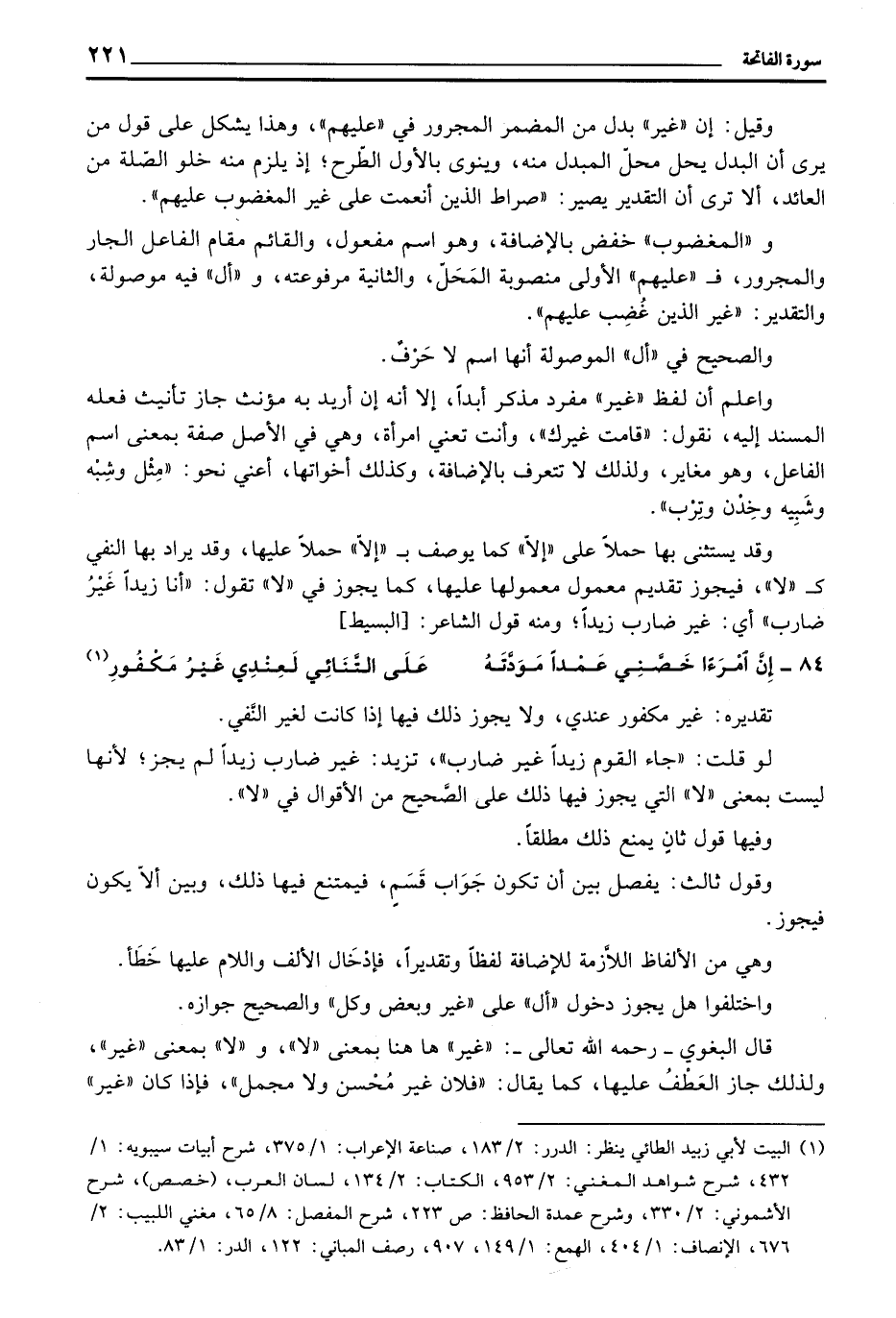 وقيل: إن «غير» بدل من المضمر المجرور في «عليهم» ، وهذا يشكل على قول من يرى أن البدل يحل محل المبدل منه، وينوي بالأول الطّرح؛ إذ يلزم منه خلة الصّلة من العائد، ألا ترى أن التقدير يصير: «صراط الذين أنعمت على غير المغضوب عليهم» .