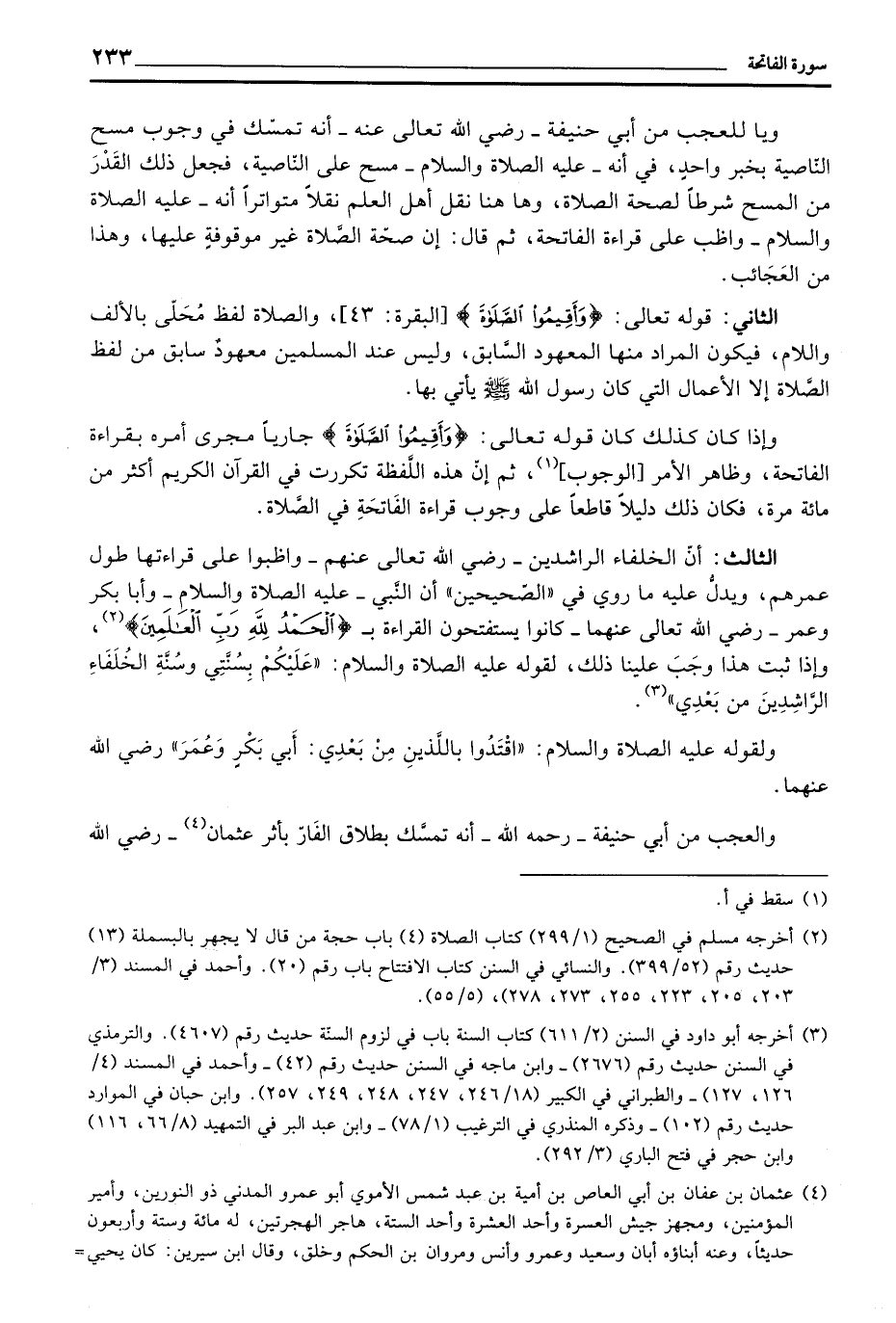 ويا للعجب من أبي حنيفة - رضي الله تعالى عنه - انه تمسّك في وجوب مسح النّاصية بخبر واحدٍ، في أنه - عَلَيْهِ الصَّلَاة وَالسَّلَام ُ - مسح على النّاصية، فجعل ذلك القَدْرَ من المسح شرطاً لصحة الصلاة، وها هنا نقل أهل العلم نقلاً متواتراً أنه - عَلَيْهِ الصَّلَاة وَالسَّلَام ُ - واظب على قراءة الفاتحة، ثم قال: إن صحّة الصَّلاةِ غير موقوفةٍ عليها، وهذا من العَجَائب.
