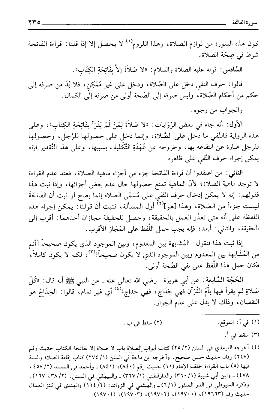 الحُجَّة السَّابعة: عن أ [ي هريرة - رضي الله تعالى عنه - عن النبي صَلَّى الله عَلَيْهِ وَسَلَّم َ أنه قال: «كُلّ صَلاَةٍ لم يقرأ فيها بِأُمِّ القُرْآنِ فهي خِدَاج، فهي خداج» أي غير تمام، قالوا: الخِدّاجُ هو النقصان، وذلك لا يدل على عدم الجواز.