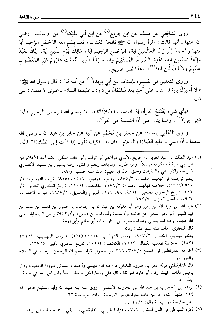 روى الشافعي عن مسلم عن ابن جريج عن ابن أبي مُلَيْكة عن أم سلمة - رَضِيَ اللهُ عَنْها - أنها قالت: «قرأ رسول الله صَلَّى الله عَلَيْهِ وَسَلَّم َ فاتحة الكتاب، فعد بِسْمِ الله الرَّحْمَنِ الرَّحِيم آية منها والحَمْدُ لِلَّهِ رَبِّ العَالَمِينَ آية، الرَّحْمَنِ الرَّحِيمِ آية، مَالِكِ يَوْمِ الدِّينِ آية، إيَّاكِ نَعْبُدُ وَإيَّاكَ نَسْتَعِينُ آية، اهْدِنَا السِّراطَ المُسْتَقِيمَ آية، صِرَاطَ الَّذِينّ أَنْعَمْتَ عَلَيْهِمْ غَيْرِ المَغْضُوبِ عَلَيْهِمْ وَلا الضَّالِّينَ آية» ، وهذا نَصّ صريح.