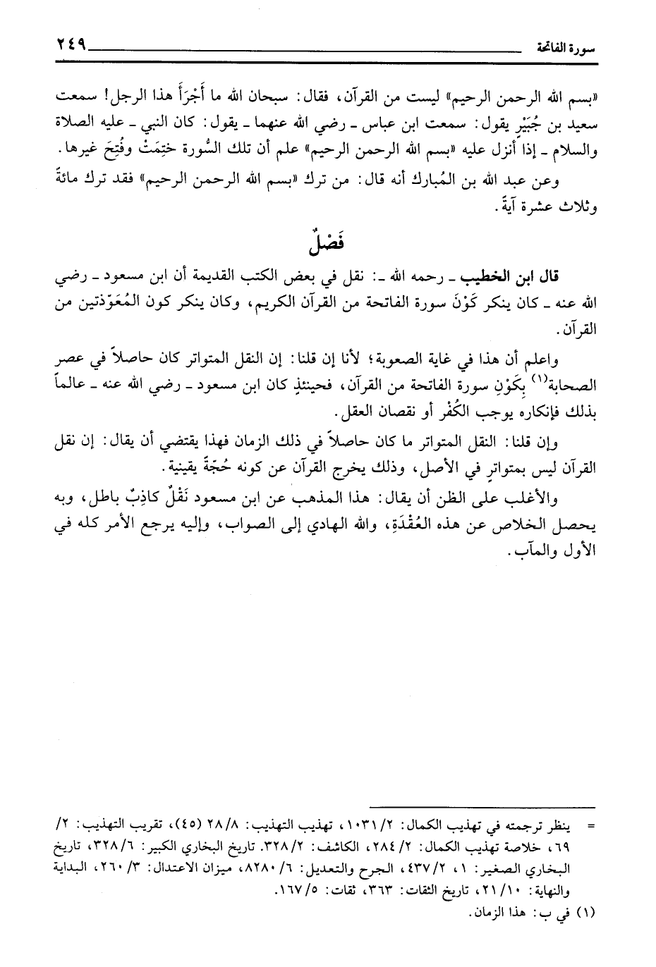واعلم أن هذا في غاية الصعوبة؛ لأنا إن قلنا: إن النقل المتواتر كان حاصلاً في عصر الصحابة بِكَوْنِ سورة الفاتحة من القرآن، فحينئذٍ كان ابن مسعود - رَضِيَ اللهُ عَنْه - عالماً فإنكاره يوجب الكُفْر أو نقصان العقل.