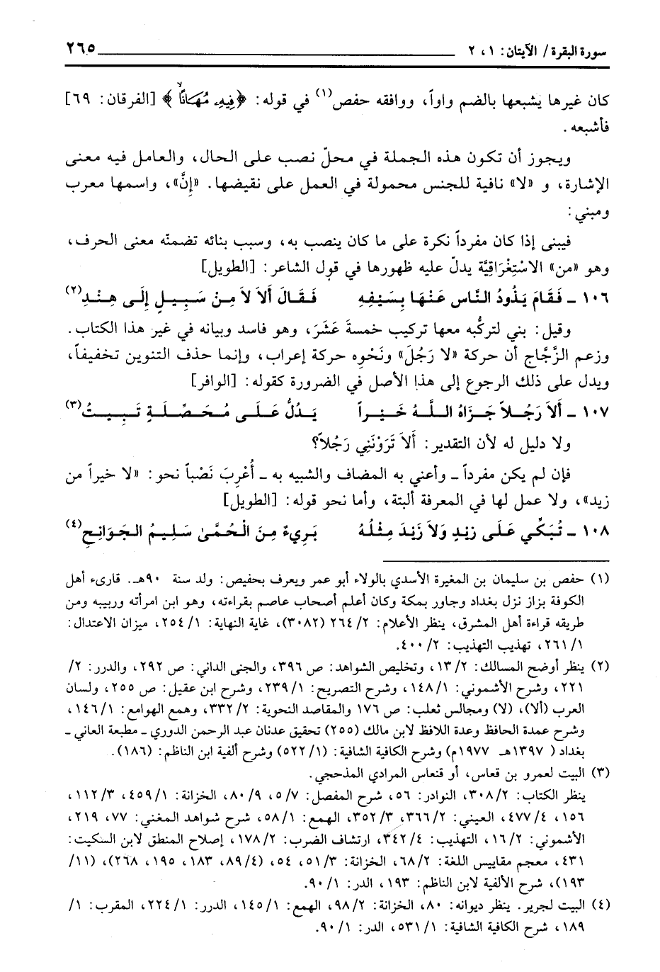 وقيل: بني لتركُّبه معها تركيب خمسةَ عَشَرَ، وهو فاسد وبيانه في غير هذا الكتاب. وزعم الزَّجَّاج أن حركة «لاَ رَجُلَ» ونَحْوِه حركة إعراب، وإنما حذف التنوين تخفيفاً، ويدل على ذلك الرجوع إلى هذا الأصل كقوله: [الوافر]