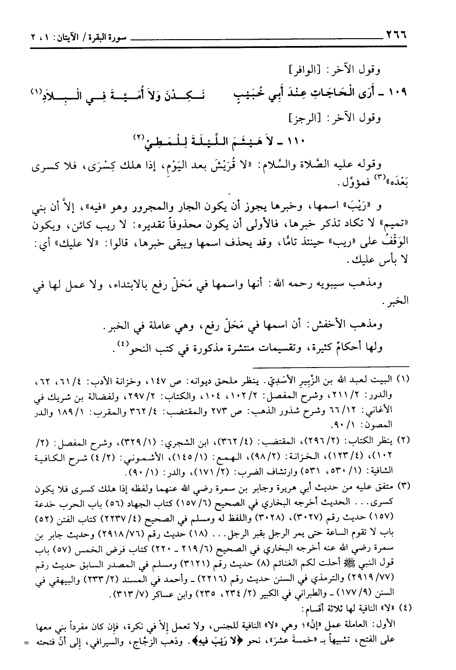 110 - لاَ هَيْثَمَ اللَّيْلَةَ لِلْمَطِيِّ ... وقوله عليه الصَّلاة والسَّلام:» لا قُرَيْشَ بعد اليَوْمِ، إذا هلك كِسْرَى، فلا كسرى بَعْدَه «فمؤوَّل.