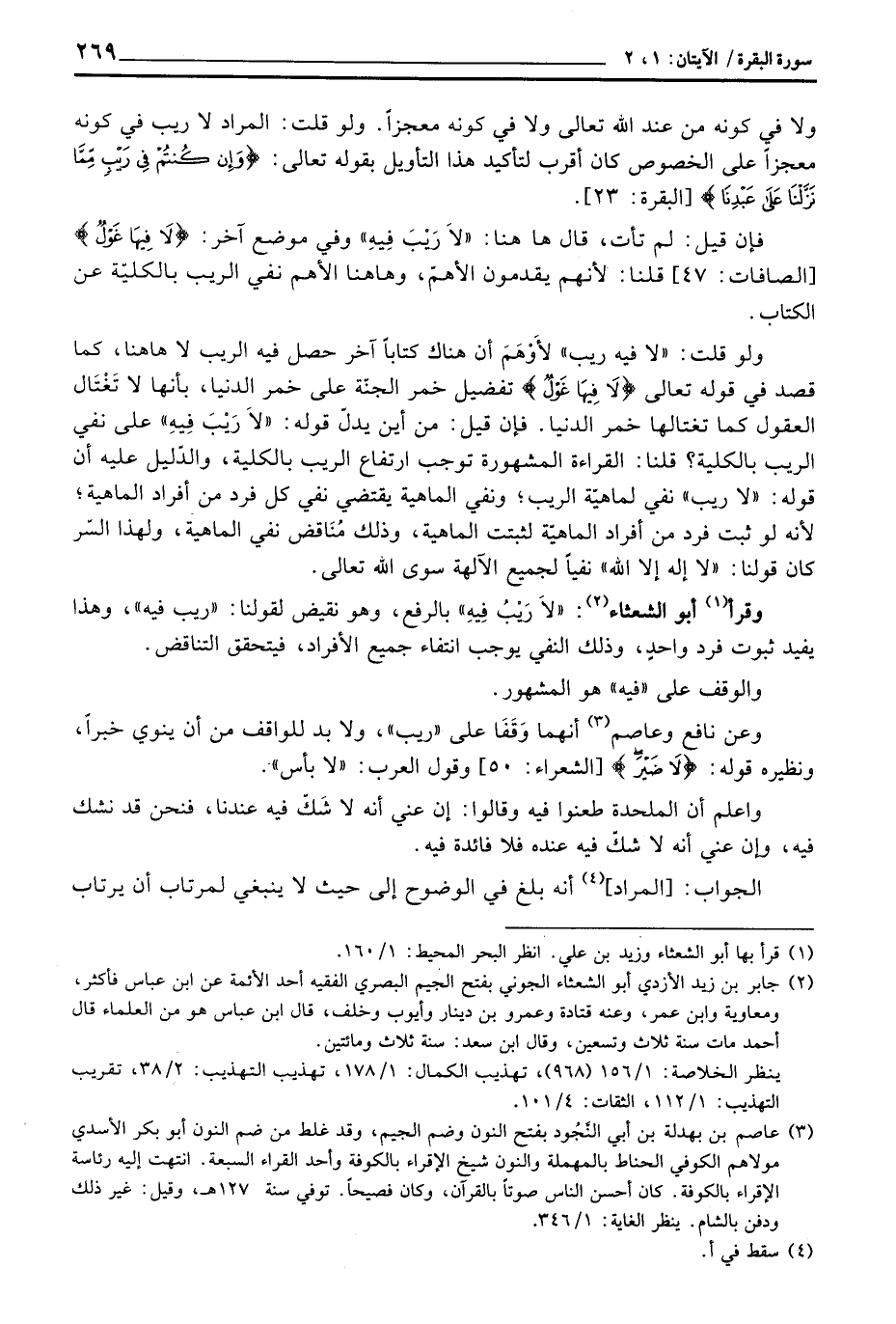 ولو قلت: «لا فيه ريب» لأَوْهَمَ أن هناك كتاباً آخر حصل فيه الريب لا ها هنا، كما قصد في قوله تعالى {لاَ فِيهَا غَوْلٌ} تفضيل خمر الجنّة على خمر الدنيا، بأنها لا تَغْتَال العقول كما تغتالها خمر الدنيا. فإن قيل: من أين يدلّ قوله: «لاَ رَيْبَ فِيهِ» على نفي الريب بالكلية؟ قلنا القراءة المشهورة توجب ارتفاع الريب بالكلية، والدّليل عليه أن قوله: «لا ريب» نفي لماهيّة الريب؛ ونفي الماهية يقتضي نفي كل فرد من أفراد الماهية؛ لأنه لو ثبت فرد من أفراد الماهيّة لثبتت الماهية، وذلك مُنَاقض نفي الماهية، ولهذا السّر كان قولنا: «لا إله إلا الله» نفياً لجميع الآلهة سوى الله تعالى.