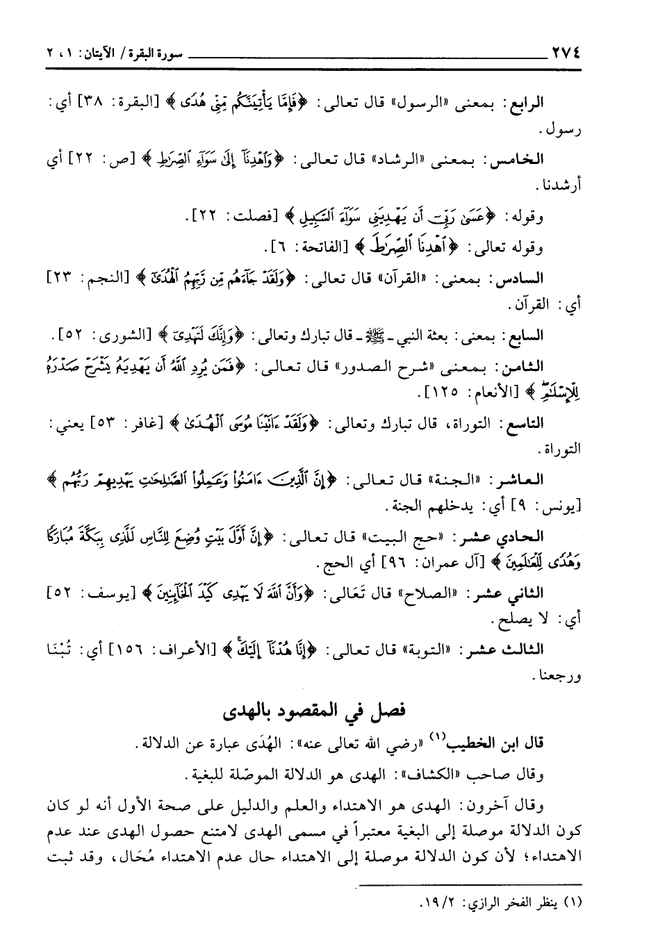 قال ابن الخطيب «رضي الله تعالى عنه» : الهُدَى عبارة عن الدلالة.
