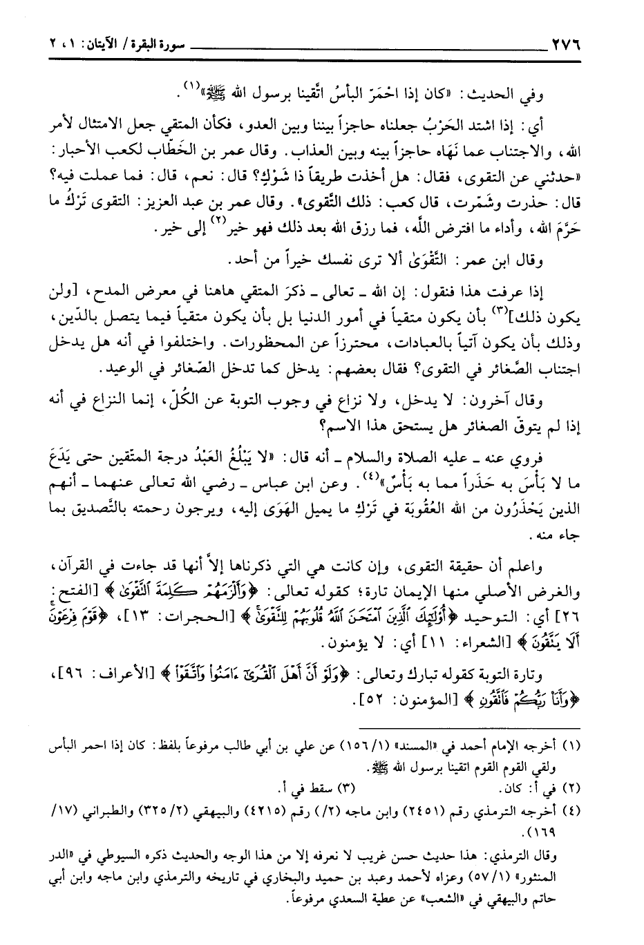 فروي عنه - عَلَيْهِ الصَّلَاة وَالسَّلَام ُ - أنه قال: «لا يَبْلُغُ العَبْدُ درجة المتّقين حتى يَدَعَ ما لا بَأسَ به حَذَراً مما به بَأسُ» . وعن ابن عباس - رضي الله تعالى عنهما - أنهم الذين يَحْذَرُون من الله العُقُوبَة في تَرْكِ ما يميل الهَوَى إليهن ويرجعون رحمته بالتَّصديق بما جاء منه.