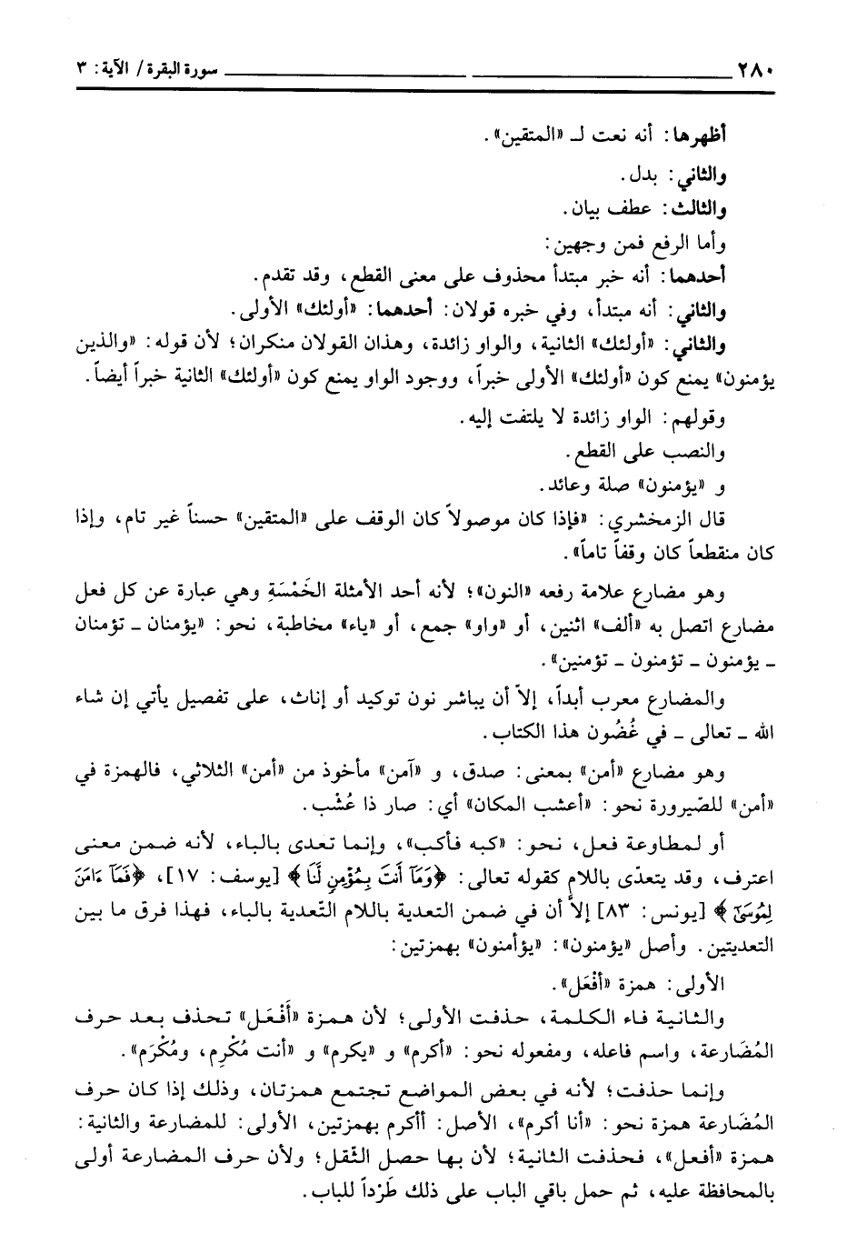 وهو مضارع علامة رفعه «النون» ؛ لأنه أحد الأمثلة الخَمْسَةِ وهي عبارة عن كل فعل مضارع اتصل به «ألف» اثنين، أو «واو» جمع، أو «ياء» مخاطبة، نحو: «يؤمنان - تؤمنان - يؤمنون - تؤمنون - تؤمنين» .