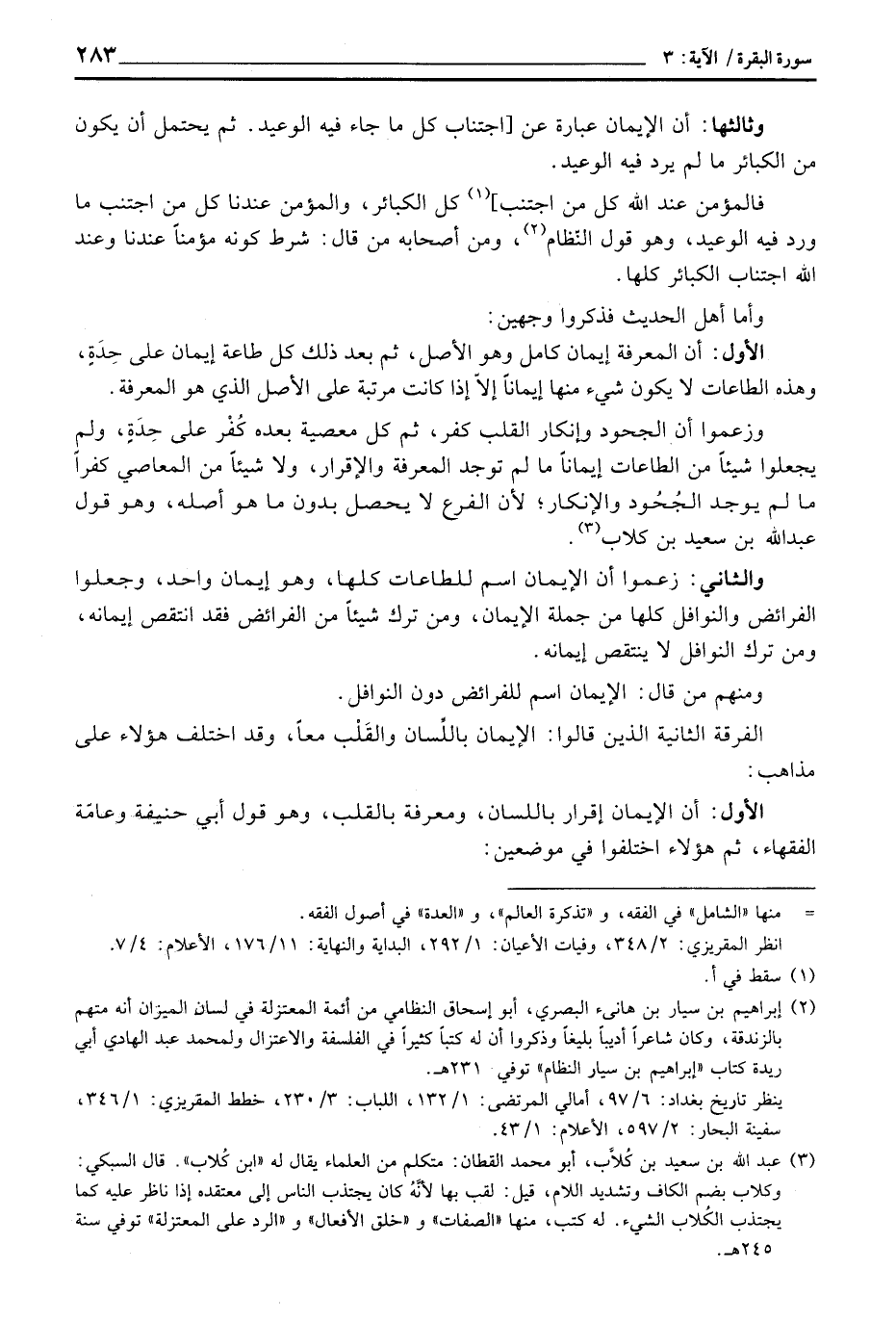 وثالثها: أن الإيمان عبارة عن [اجتناب كل ما جاء فيه الوعيد. ثم يحتمل أن يكون من الكبائر ما لم يرد فيه الوعيد] .