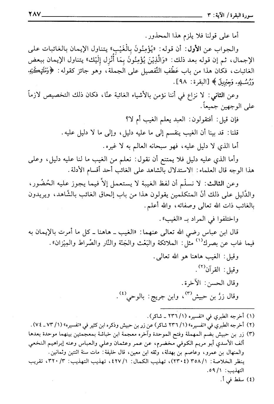 قال ابن عباس رضي الله تعالى عنهما: «الغيب - ها هنا - كل ما أمرت بالإيمان به فيما غاب عن بصرك مثل: الملائكة والبَعْث والجَنّة والنَّار والصِّراط والمِيزَان» .