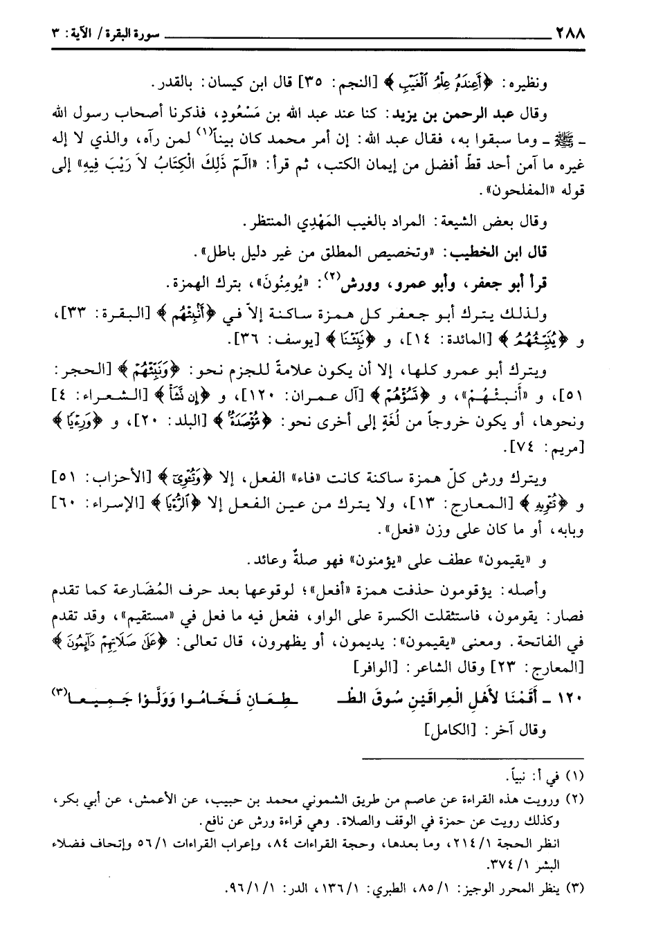 ويترك ورش كلّ همزة ساكنة كانت «فاء» الفعل، إلا {وتؤويا} [الأحزاب: 51] و {تُؤْوِيهِ} [المعارج: 13] ، ولا يترك من عين الفعل إلا {الرؤيا} [الإسراء: 60] وبابه، أو ما كان على وزن «فعل» . و «يقيمون» عطف على «يؤمنون» فهو صلةٌ وعائد.