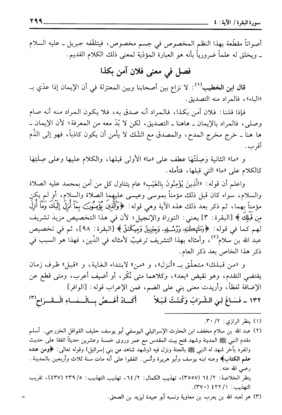 واعلم أن قوله: «الَّذِينَ يُؤْمِنُونَ بِالغَيْبِ» عام يتناول كل من آمن بمحمد عَلَيْهِ الصَّلَاة وَالسَّلَام ُ، سواء كان قبل ذلك مؤمناً بموسى وعيسى عليهما الصلاة والسلام، أو لم يكن مؤمناً بهما، ثم ذكر بعد ذلك هذه الآية وهي قوله: {والذين يُؤْمِنُونَ بِمَآ أُنْزِلَ إِلَيْكَ وَمَآ أُنْزِلَ مِن قَبْلِكَ} [البقرة: 4] يعني: التوراة والإنجيل؛ لأن في هذا التخصيص مزيد تشريف لهم كما في قوله: {وملاائكته وَرُسُلِهِ وَجِبْرِيلَ وَمِيكَالَ} [البقرة: 98] ، ثم في تخصيص عبد الله بن سلام، وأمثاله بهذا التشريف ترغيبٌ لأمثاله في الدِّين، فهذا هو السبب في ذكر هذا الخاص بعد ذكر العام.