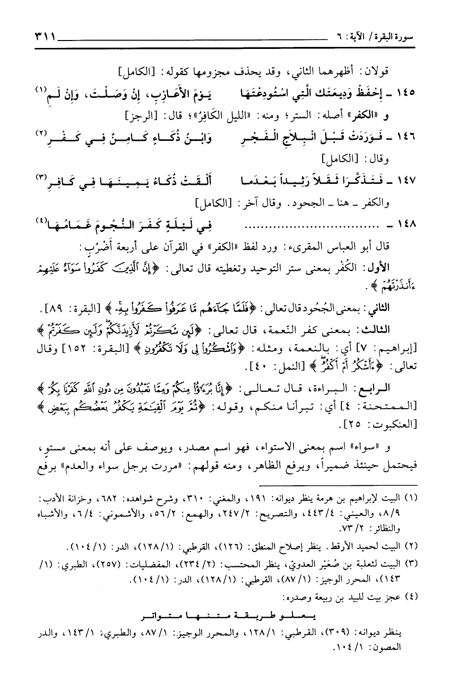 قال أبو العباس المقرىء: ورد لفظ «الكفر» في القرآن على أربعة أَضْرُبٍ: