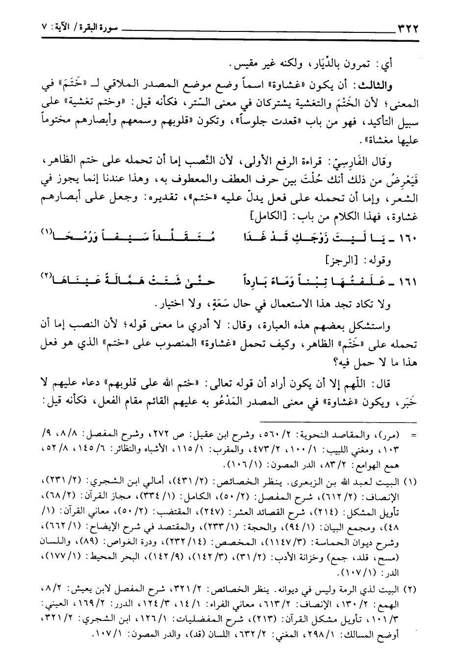 وقال الفَارِسِيّ: قراءة الرفع الأولى، لأن النَّصب إما أن تحمله على فعل يدلّ عليه «ختم» ، تقديره: وجعل على أبصارهم غشاوة، فهذا الكلام من باب: [الكامل]