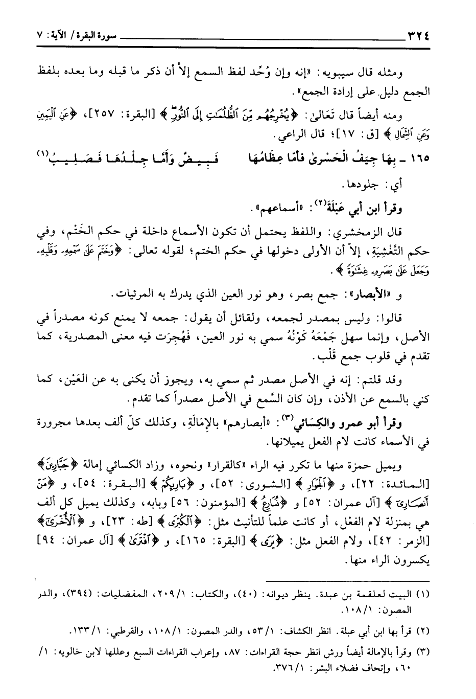 ومثله قال سيبويه: «إنه وإن وُحِّد لفظ السمع إلاَّ أن ذكر ما قبله وما بعجه بلفظ الجمع دليل على إرادة الجمع» .