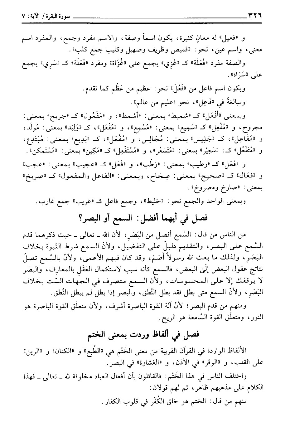 واختلف الناس في هذا الخَتْم: فالقائلون بأن أفعال العباد مخلوقة لله - تعالى - فهذا الكلام على مذهبهم ظاهر، ثم لهم قولان: