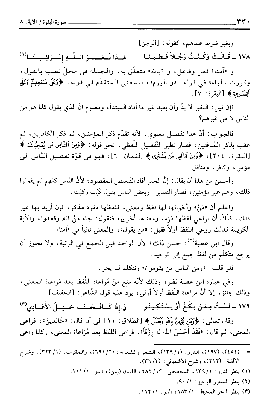 واعلم أن «مَنْ» وأخواتها لها لفظ ومعنى، فلفظها مفرد مذكر، فإن أريد بها غير ذلك، فَلَكَ أن تراعي لفظها مَرّة، ومعناها أخرى، فتقول: جاء مَنْ قام وقعدوا، والآية الكريمة كذلك روعي اللفظ أولاً فقيل: «من يقول» ، والمعنى ثانياً في «آمنا» .