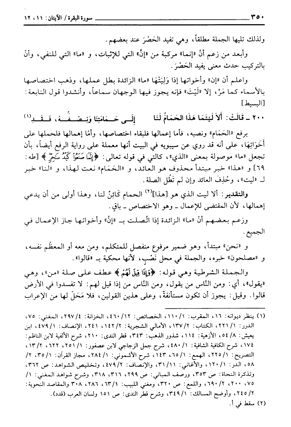 برفع «الحَمَام» ونصبه، فأما إهمالها فلبقاء اختصاصها، وأمّا إهمالها فلحملها على أَخَوَاتِهَا، على أنه قد روي عن سيبويه في البيت أنها معملة على رواية الرفع أيضاً، بأن تجعل «ما» موصولة بمعنى «الذي» ، كالتي في قوله تعالى: {إِنَّمَا صَنَعُواْ كَيْدُ سَاحِرٍ} [طه: 69] و «هذا» خبر مبتدأ محذوف هو العائد، و «الحَمَام» نعت لهذا، و «لنا» خبر ل «ليت» ، وحُذِفَ العائد وإن لم تَطُل الصلة.